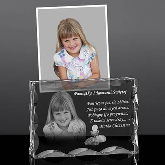 Stwórz niepowtarzalną, personalizowaną pamiątkę. Prześlij do nas zdjęcie oraz dedykację, a my wygrawerujemy je w krysztale. Zaproponujemy tematyczne ozdobniki graficzne jak kielich, hostię i inne. Po otrzymaniu materiałów przygotujemy komputerową wizualizację i prześlemy Tobie do akceptacji. Taki prezent z okazji I Komunii Świętej z pewnością będzie wędrował razem z obdarowanym nawet podczas kolejnej przeprowadzki.