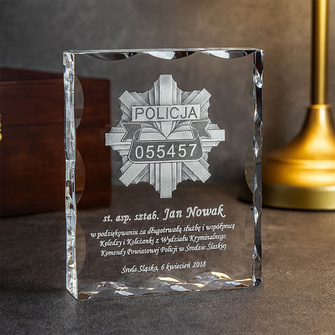 Nasze propozycje są naprawdę różnorodne – wszystko po to, by zadowolić gusta obdarowywanych. Znajdą Państwo u nas proste, klasyczne formy nadające się na pamiątkę dla policjanta, które posiadają dekoracyjne zdobienia. Jeżeli chodzi o grawer, proponujemy rozwiązania z rozmaitych dziedzin – czy to wspomnianą już odznakę policyjną, czy też zdjęcie ukochanego pupila albo podobiznę samego obdarowywanego. Ekskluzywne pamiątki szklane dla policjantów sprawdzą się w wielu okazjach – na awans, wyróżnienie czy też przejście na emeryturę. Taki trwały symbol pełnionej profesji z pewnością na stałe zagości na honorowym miejscu w domu bądź biurze stróża prawa. Kryształowe statueki pakujemy w stylowe etui, dzięki czemu prezentują się wspaniale już w momencie wręczania podarunku. Zachęcamy do przejrzenia naszej oferty i wyboru wyjątkowego upominku dla policjanta.