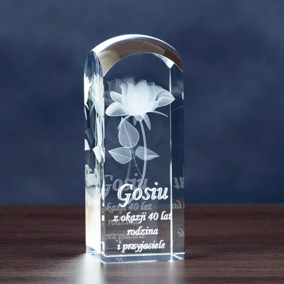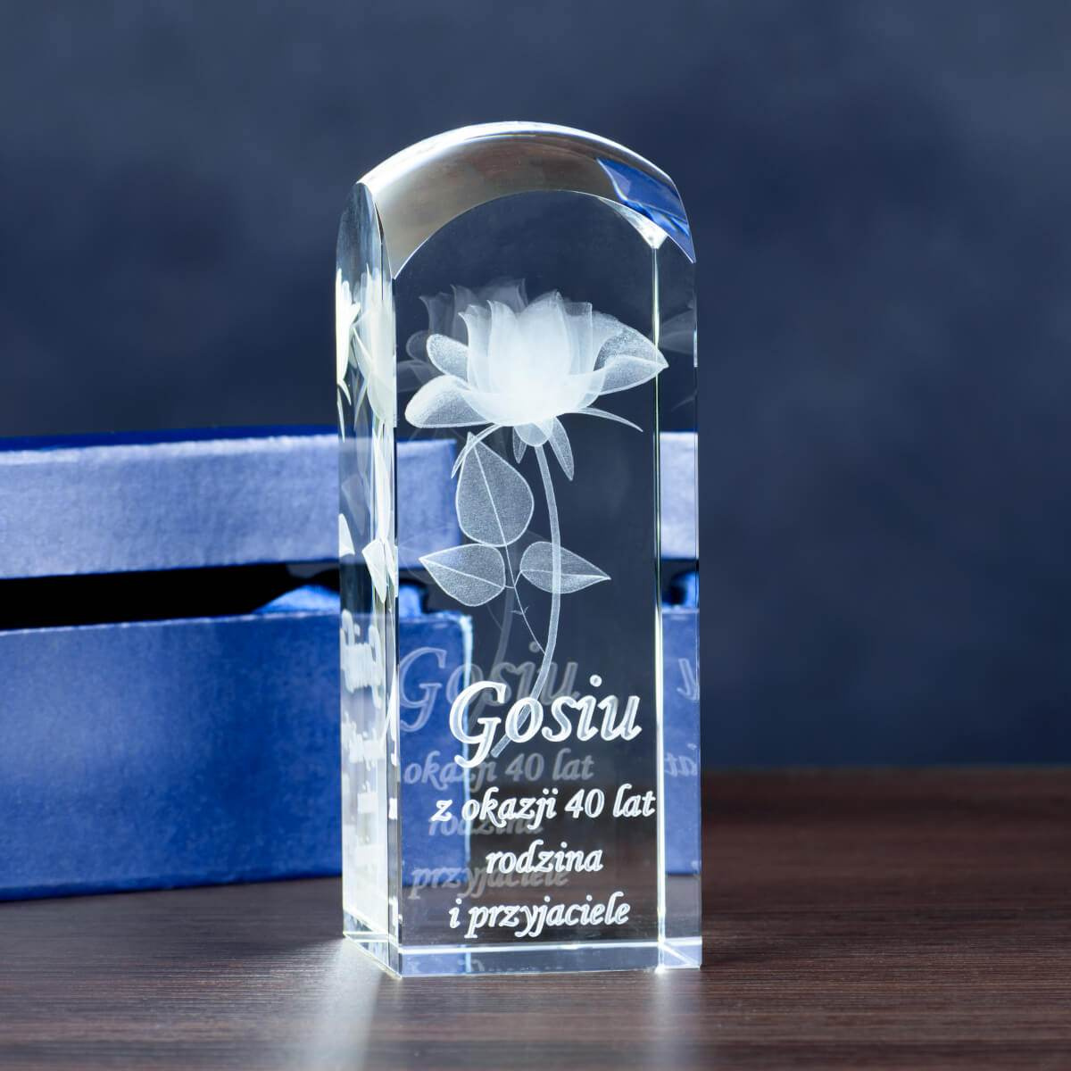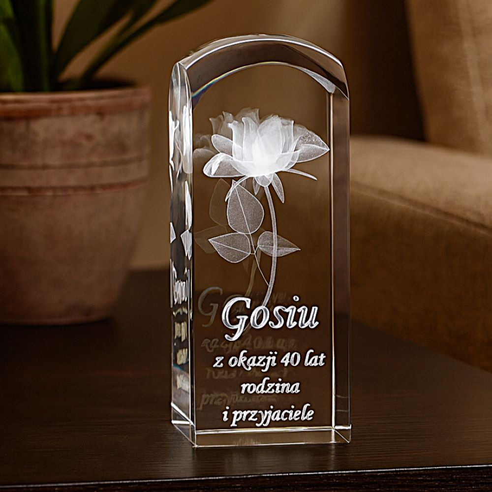 • Elegancka kryształowa statuetka, a w niej wygrawerowana trójwymiarowa róża. Twoja dedykacja zostanie wygrawerowana pod Różą 3D. Tym samym stworzysz niepowtarzalny, jedyny prezent, którym zaskoczysz obdarowanych. Etui w komplecie