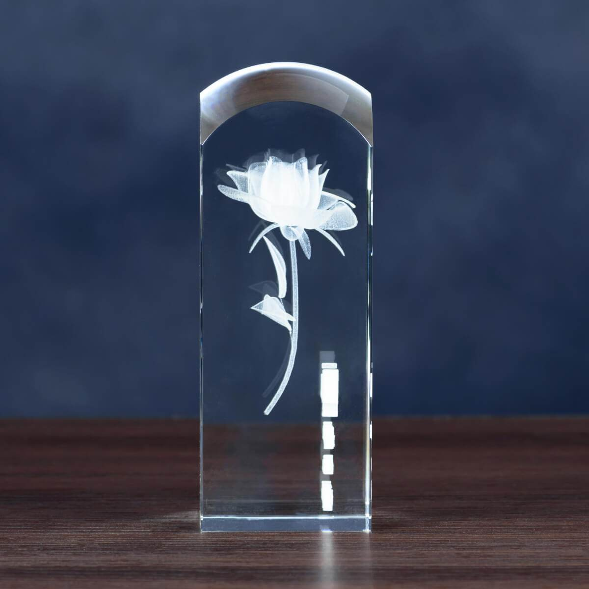 Wysublimowana w swojej szlachetnej i nieskazitelnej formie róża 3D przepięknie harmonizuje z kryształową tonią eleganckiej statuetki będącej doskonały pomysłem na prezent z okazji oświadczyn, ślubu czy wszelkiego rodzaju dostojnych jubileuszy Misternie wykonane grawerowanie w szkle pozwala na uzupełnienie statuetki osobistym wyznaniem, podziękowaniem czy życzeniami. Genialna forma o niespotykanym kształcie, indywidualna dedykacja i przepiękna róża trafią do serca obdarowanej osoby i nie pozwolą zapomnieć o miłych chwilach.