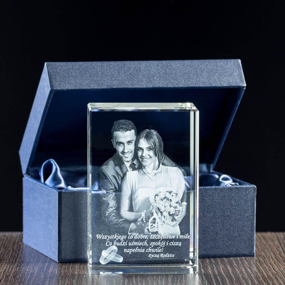 Zdjęcie wygrawerowane w kryształowej bryle typu Prostopadłościan o wymiarach 80x120x60 mm. Własne dedykacje i podpisy wliczone w cenę. Po otrzymaniu zamówienia ze zdjęciem i tekstem przesyłamy komputerową wizualizację do akceptacji. Statuetka pakowana w eleganckie etui.