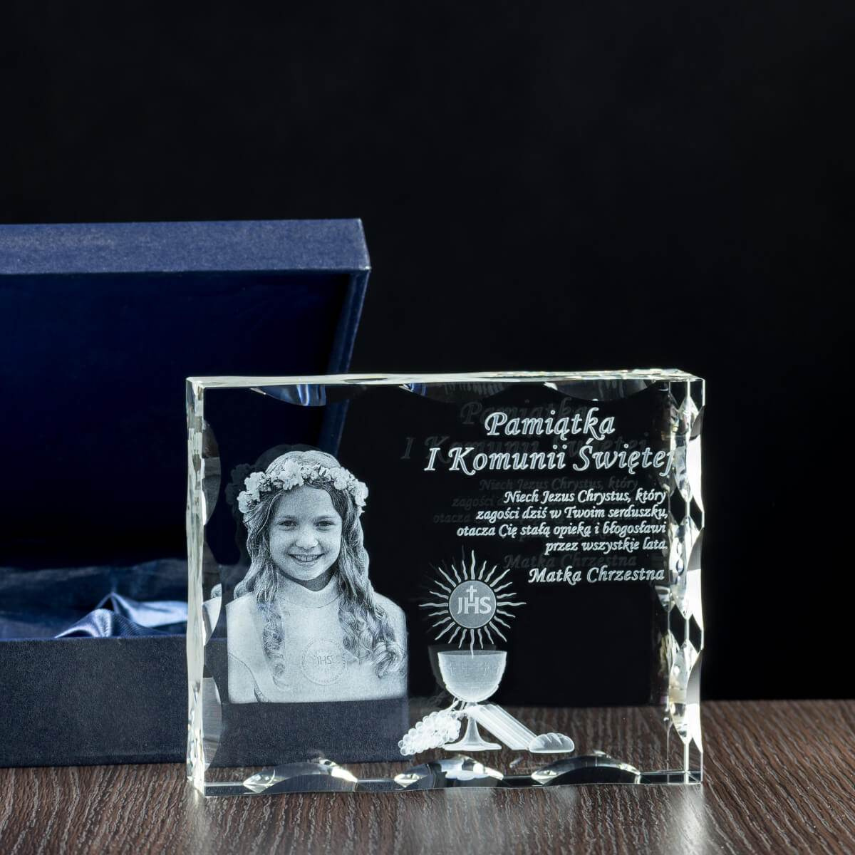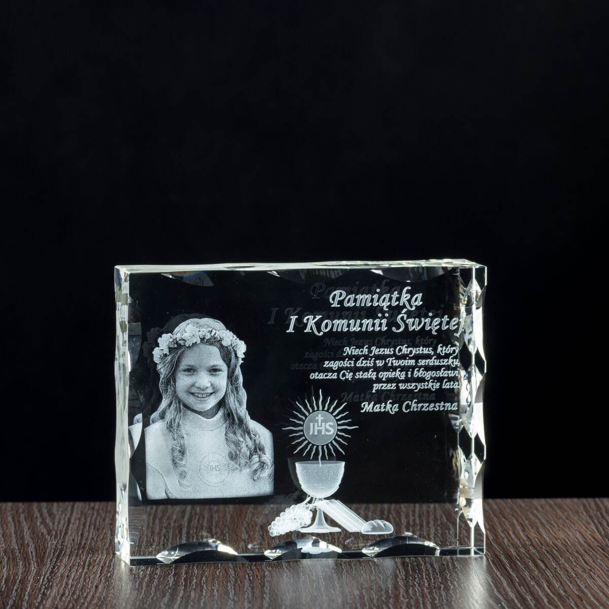 Statuetka kryształowa 3D – Pamiątka I Komunii Świętej z wizerunkiem dziecka i dedykacją