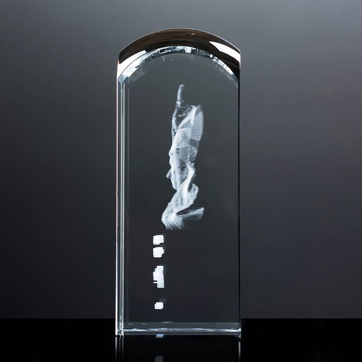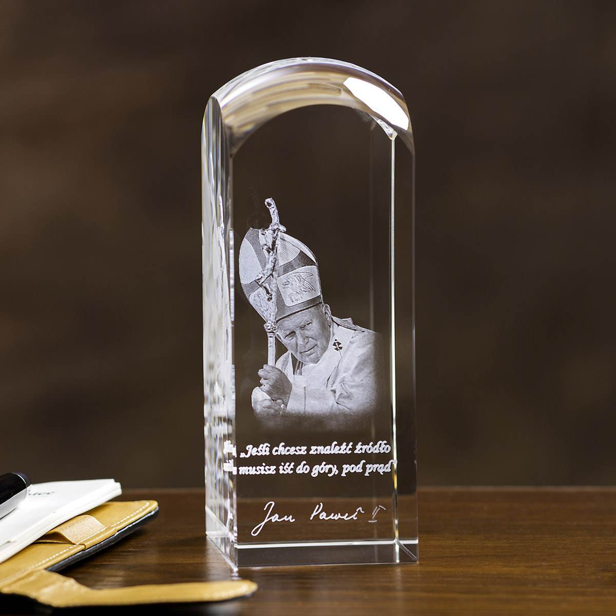 - Trójwymiarowe zdjęcia Jana Pawła II wygrawerowane w kryształowej statuetce. Pod zdjęciem umieszczone słowa Papieża "Jeśli chcesz znaleźć źródło, musisz iść do góry, pod prąd" oraz jego oryginalny podpis. Możliwa indywidualna dedykacja