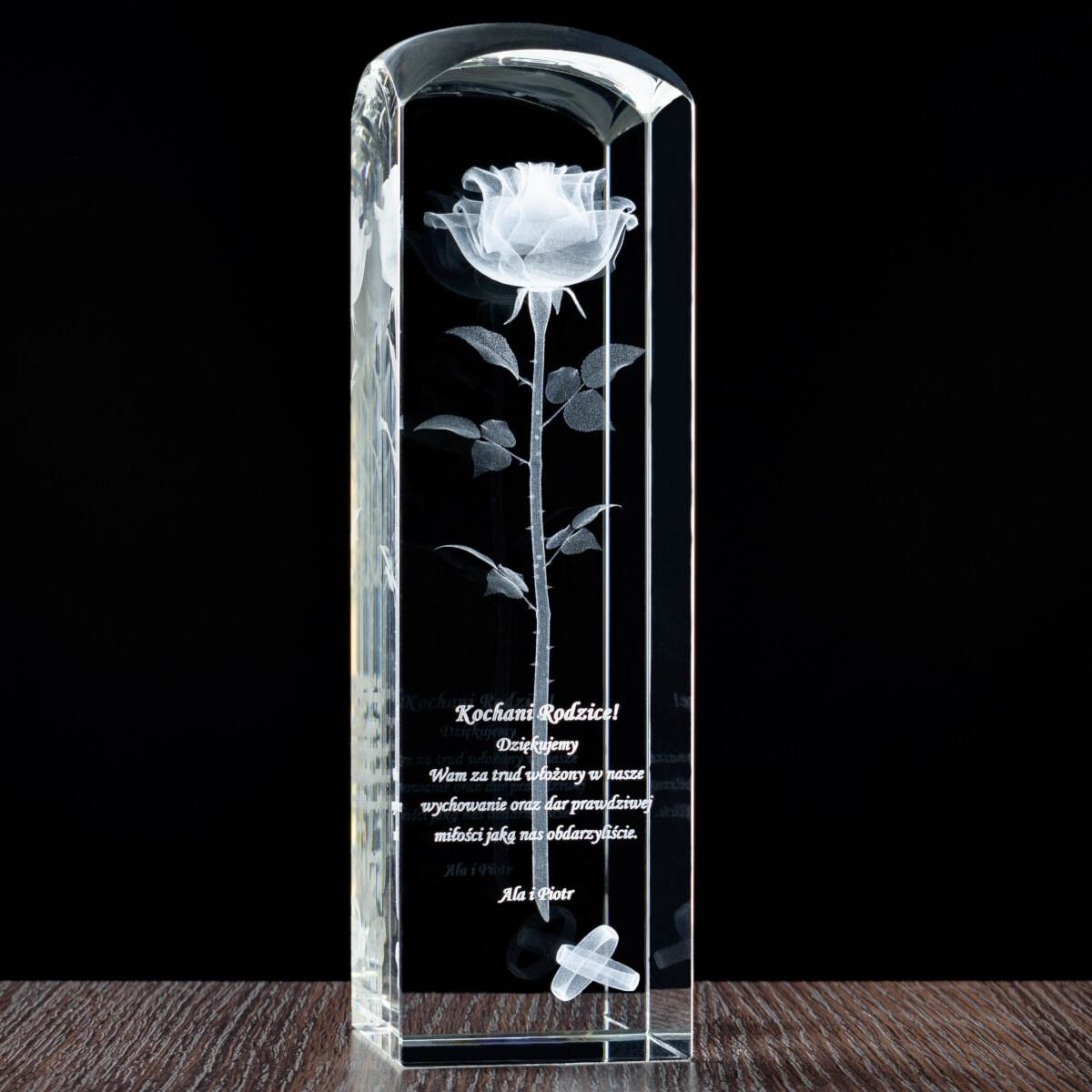 Róża 3D w dużej kryształowej statuetce 220×65×65 mm z dedykacją