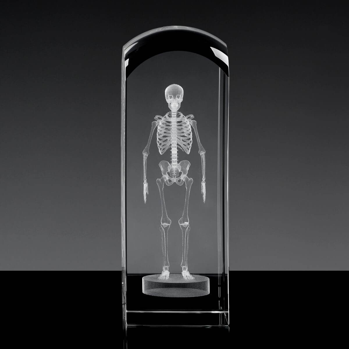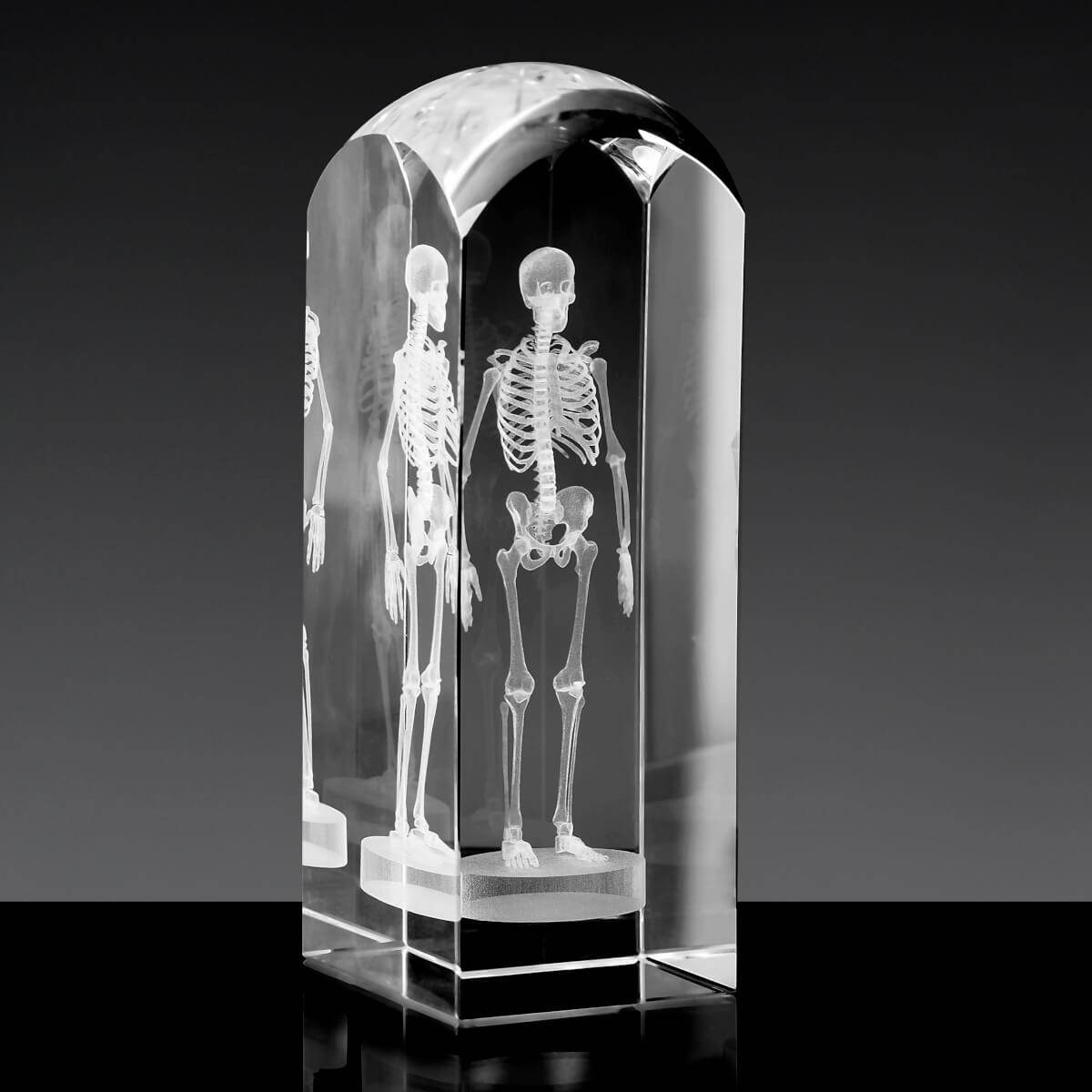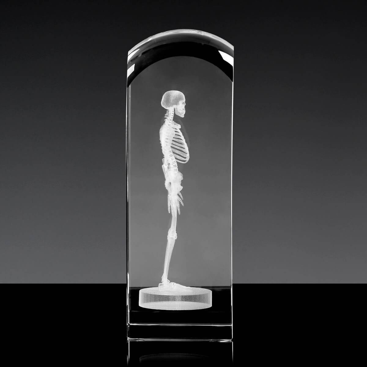Szukasz eleganckiego prezentu z klasą? Zaskakujący i ciekawy prezent dla lekarza to wyszukana kryształowa statuetka z zamkniętą wewnątrz miniaturą szkieletu. Ludzki szkielet 3D przykuwa uwagę, jest wykonany z wielką dbałością o najmniejsze szczegóły, wykorzystuje nowoczesne grawerowanie 3D. Do statuetki dołączone jest stylowe etui. Dodatkowe opcje to możliwość umieszczenia na statuetce spersonalizowanej dedykacji oraz doposażenie w podświetlaną podstawkę.