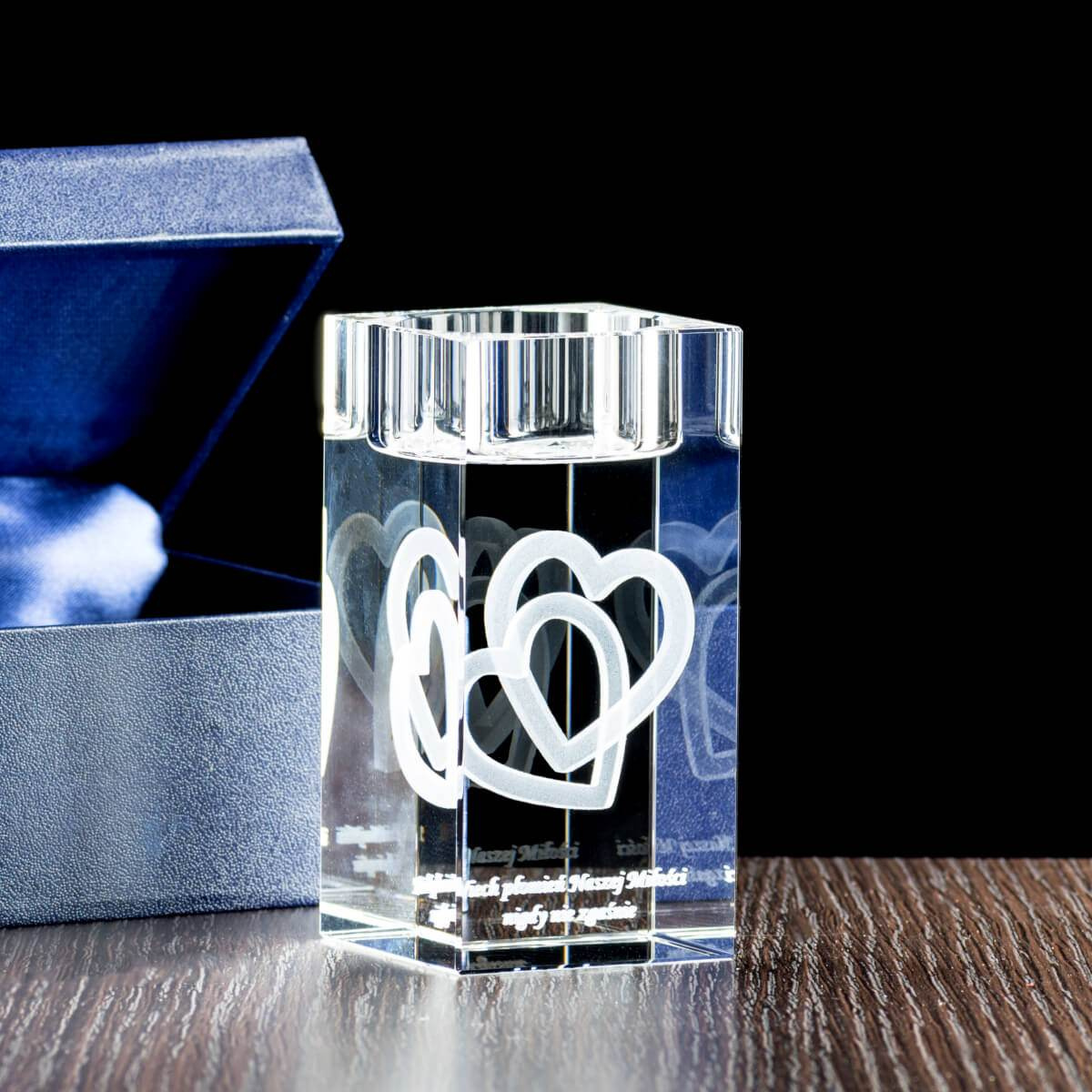- Kryształowy świecznik z grawerem 3D jako prezent dla Babci i Dziadka. W świeczniku zostały wygrawerowane połączone dwa serca w formacie 3D. Dodatkowo do serc możemy wygrawerować Twoją dedykację.
