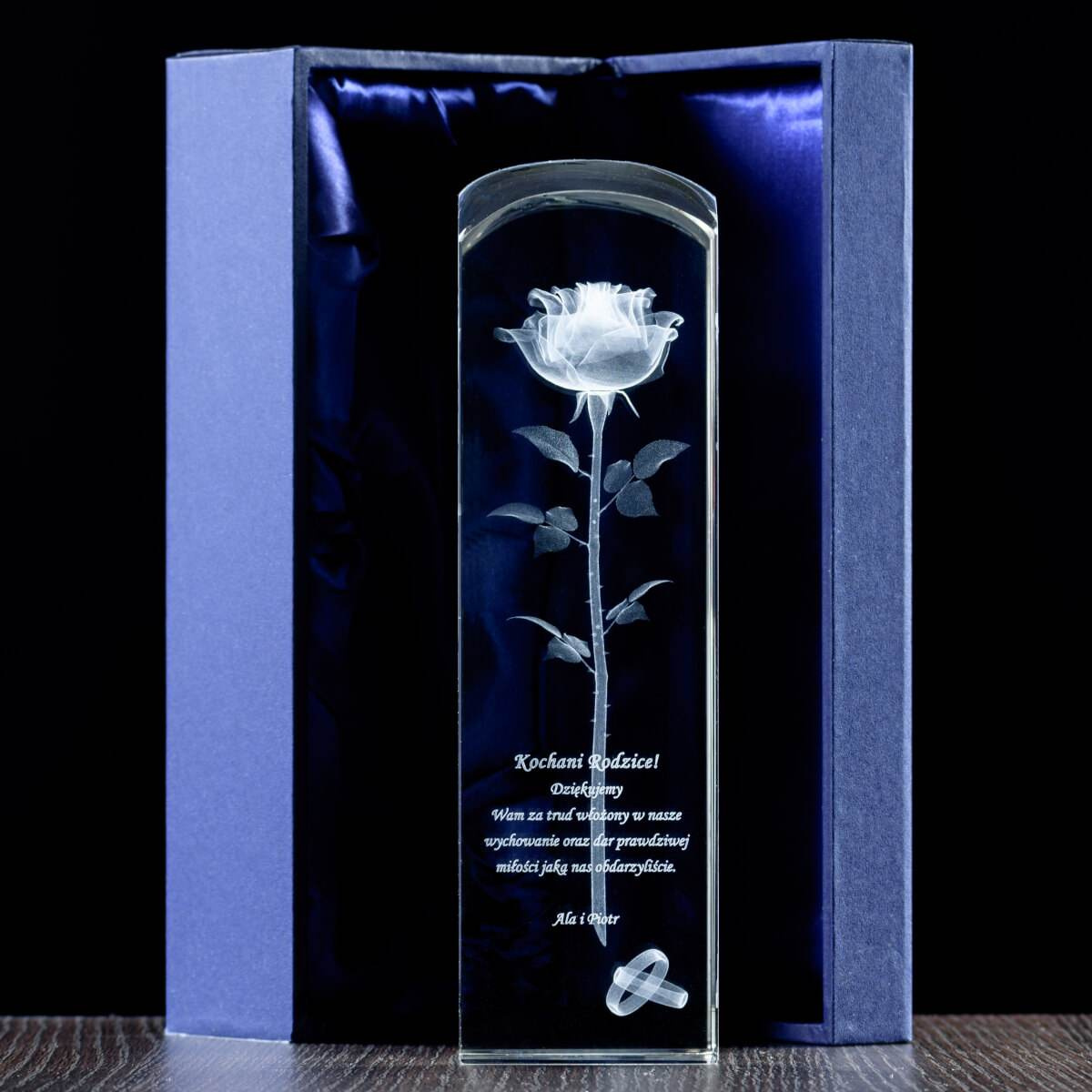 - Perfekcyjnie zaprezentowana róża 3D wypełnia przestrzeń kryształowej bryły, mieniąc się i przyciągając wzrok, by przywołać piękno wspomnień.