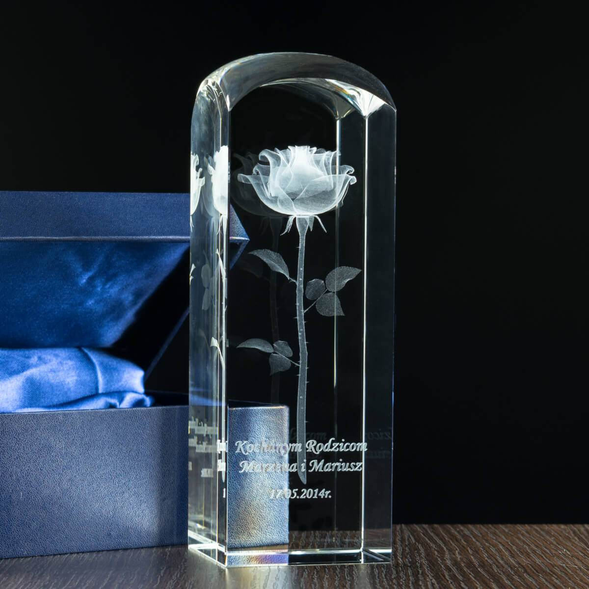Delikatność królowej kwiatów w pięknej statuetce 3D sprawi, że wszystkie dobre chwile spędzone w szkole zapiszą się w pamięci jako te wyjątkowe i wspaniałe. Kunsztownie wykonany kryształ to prezent dla nauczyciela, który poruszy strunę wzruszenia i w elegancki sposób wyrazi podziękowania. Perfekcyjnie wygrawerowana róża 3D wraz z spersonalizowaną treścią życzeń uświetni koniec roku szkolnego, a także będzie idealnym upominkiem z innych okazji. Statuetka pakowana w eleganckie etui.
