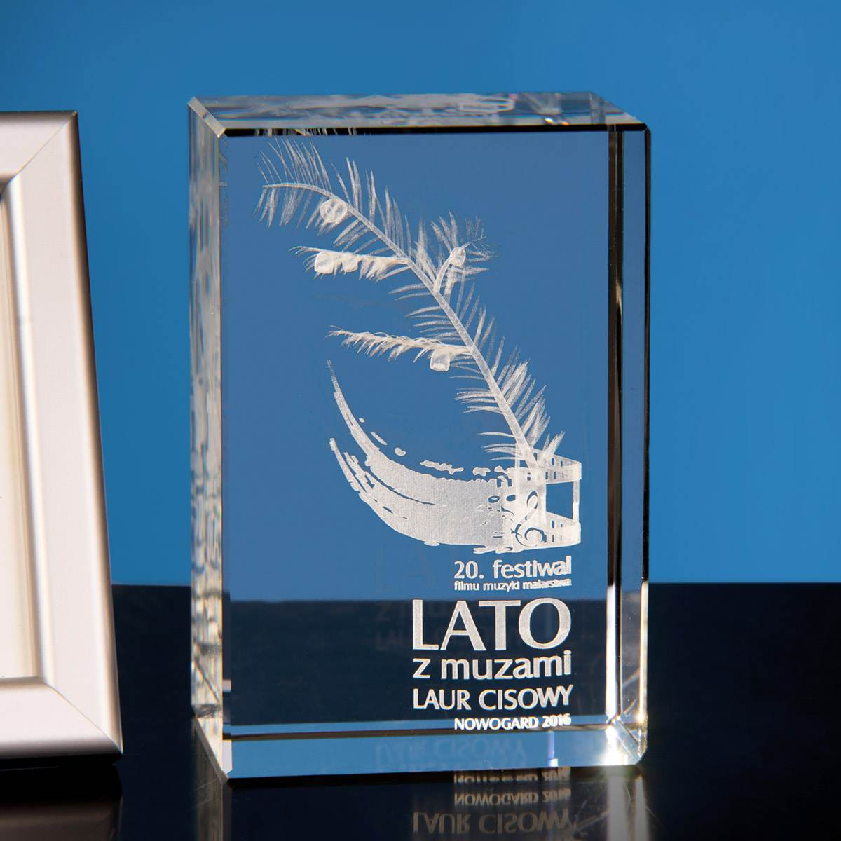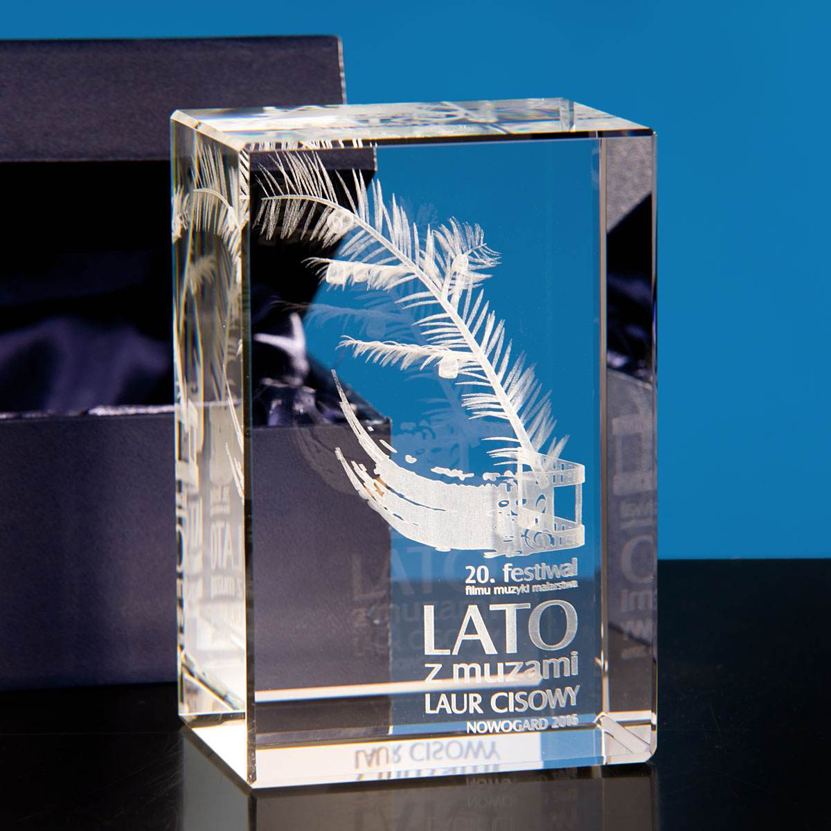 - Statuetka konkursowa 3D wygrawerowana w krysztale. Motyw festiwalu filmowego jest tylko przykładem. Statuetka pakowana w eleganckie etui.