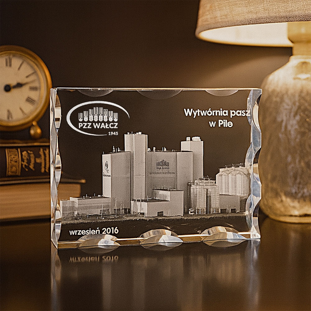 - Statuetka firmowa z trójwymiarowym budynkiem firmy. Oryginalny upominek jubileuszowy bądź pamiątkowy z okazji wybudowania nowej siedziby. Cena dotyczy kryształu oraz projektu 2.5D przesłanego zdjęcia budynku.