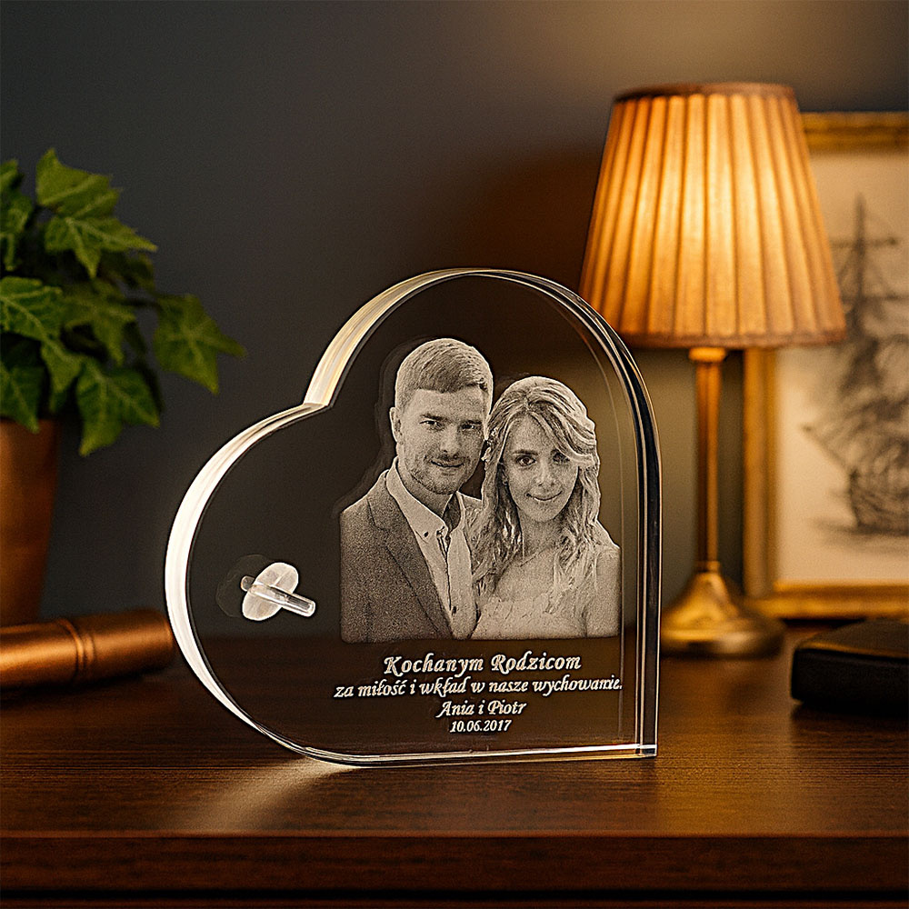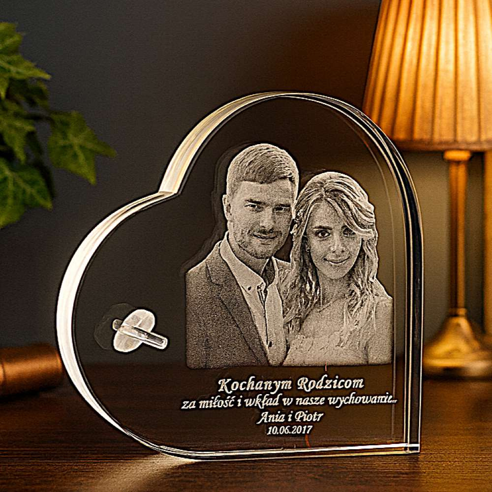 - Romantyczna statuetka w kształcie serca z wygrawerowanym zdjęciem i indywidualną dedykacją. Wyjątkowy prezent na rocznicę. Możliwość podświetlanej podstawki dla efektownej ekspozycji.