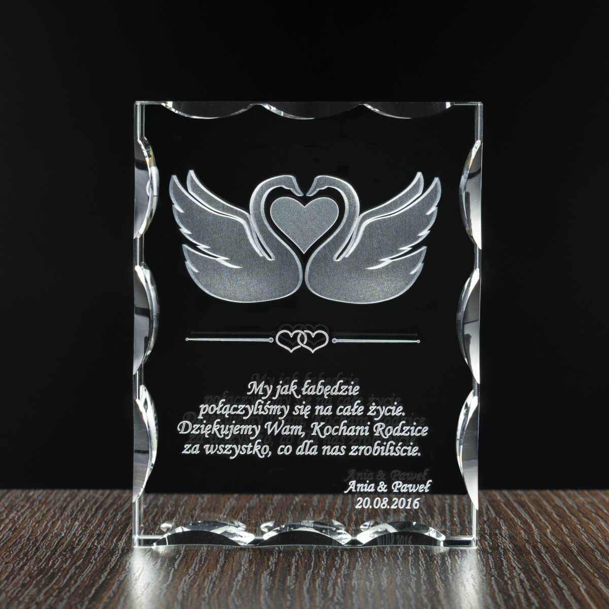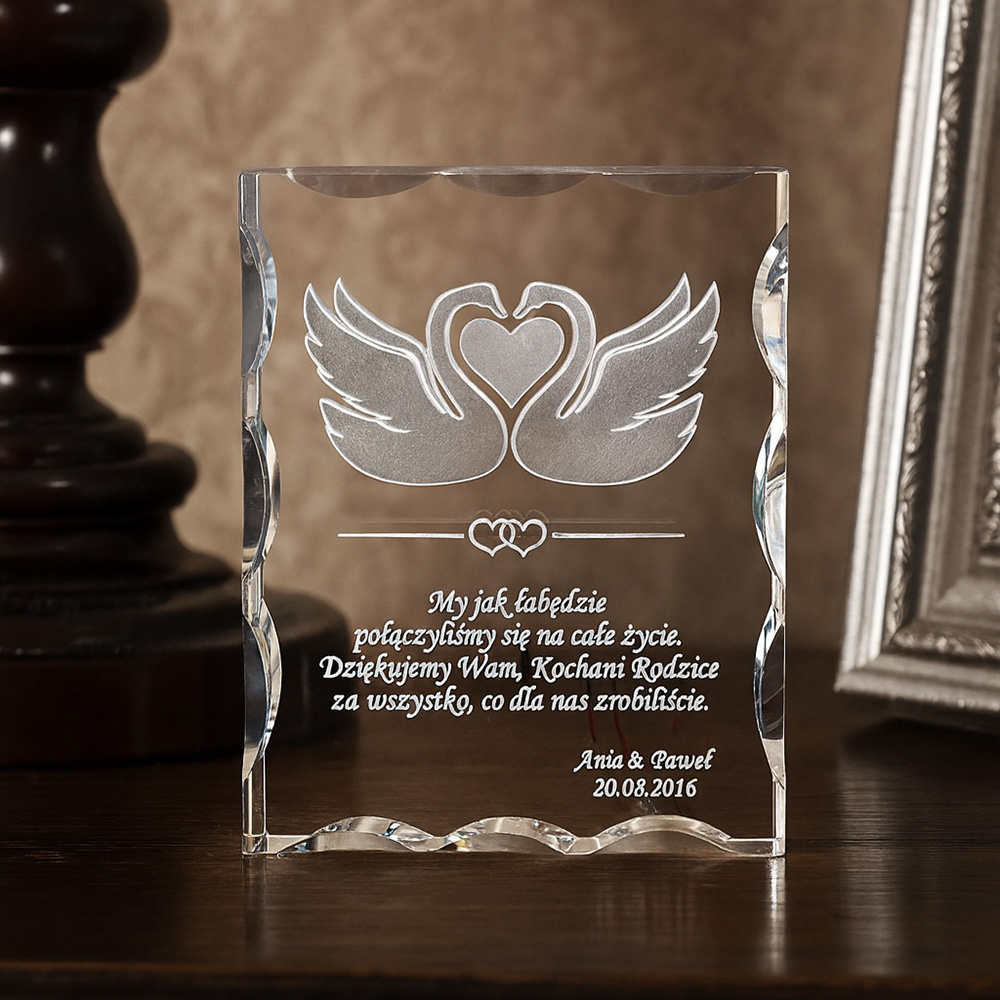 Zakochane łabędzie wygrawerowane w zdobionym krysztale Lux to przepiękne podziękowanie dla rodziców. To bez wątpienia najpiękniejsze ślubne podziękowania, które nigdy nie staną się nieaktualne. Przepiękny fotoprezent w eleganckiej statuetce w pełni oddaje delikatność szczerych uczuć.