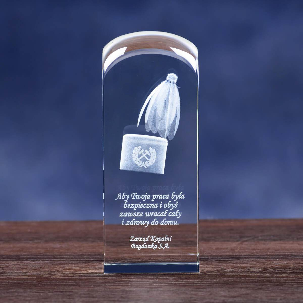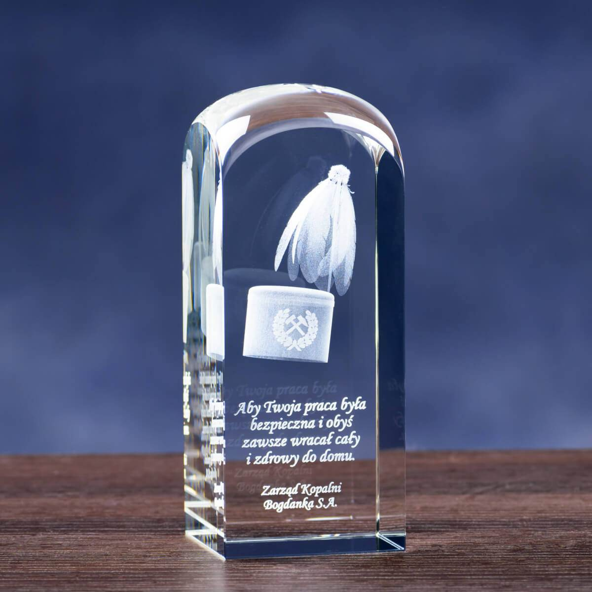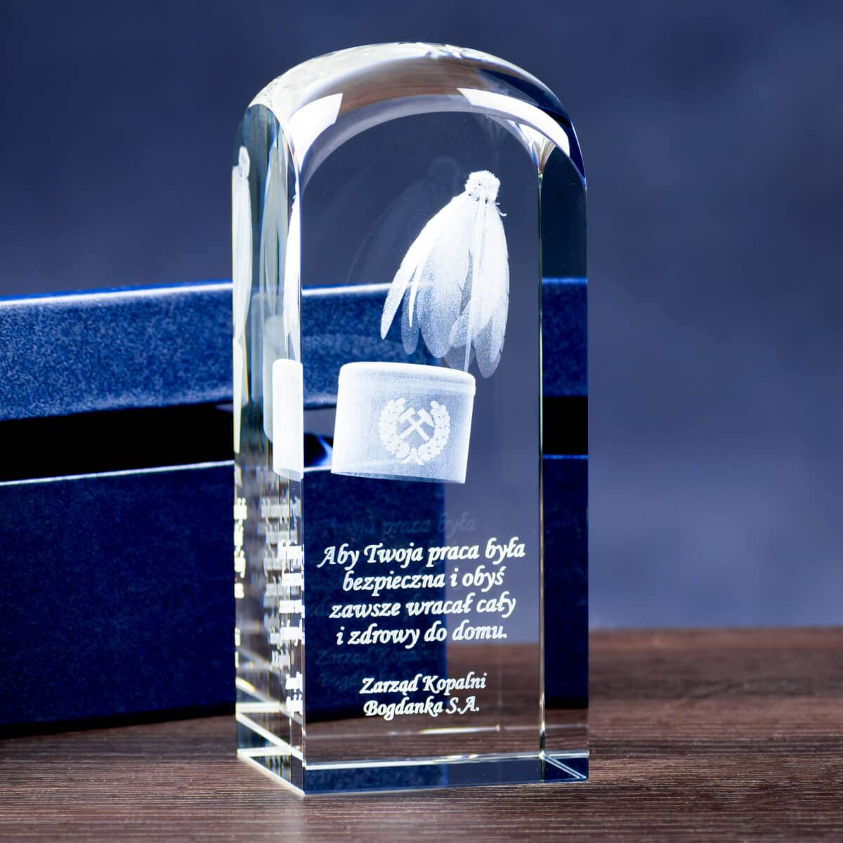 Statuetka z okazji Barbórki. Podziękowania dla górników za ciężką pracę i ryzyko ponoszone każdego dnia. Trójwymiarowa czapka górnicza wygrawerowana w szklanej statuetce oraz tematyczna dedykacją nadają oryginalnego charakteru podziękowaniom.