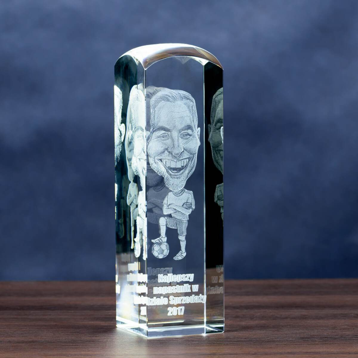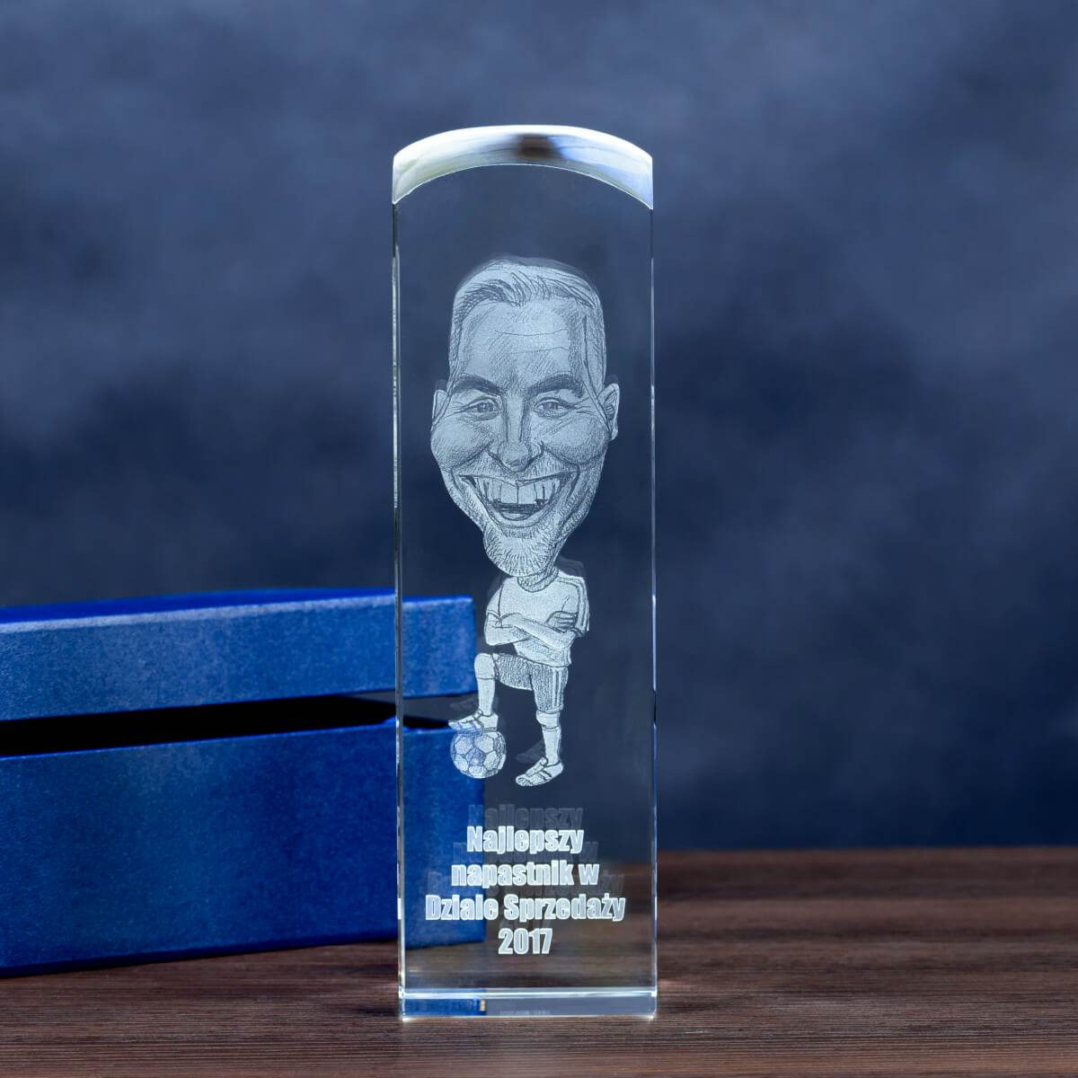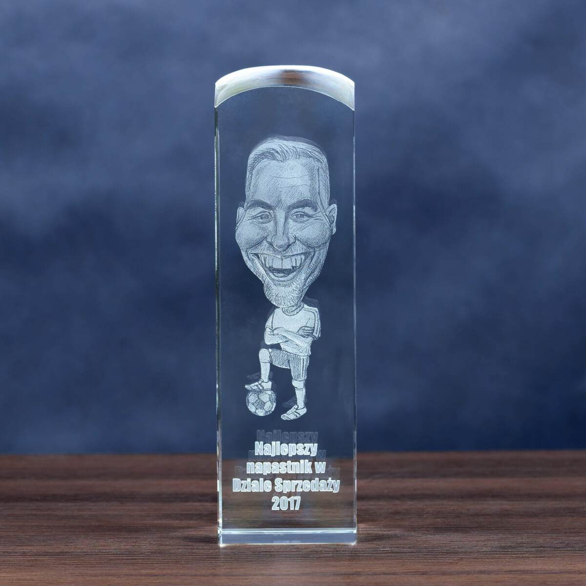 Ta okazała statuetka kryształowa to doskonały wybór, gdy chcemy w szczególny sposób uhonorować pracownika roku, wybitnego sportowca, trenera czy osobę zasłużoną. W jej wnętrzu grawerowana jest trójwymiarowa karykatura, przygotowana na podstawie przesłanego zdjęcia. Dzięki nowoczesnej technologii laserowej każdy detal zostaje odwzorowany z niezwykłą precyzją, a efekt 3D nadaje projektowi przestrzenności i wyjątkowego charakteru.
