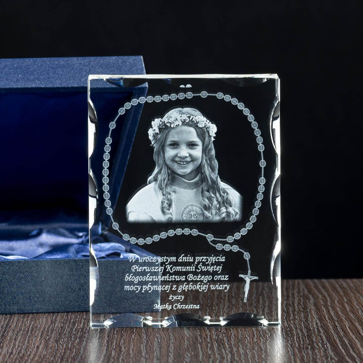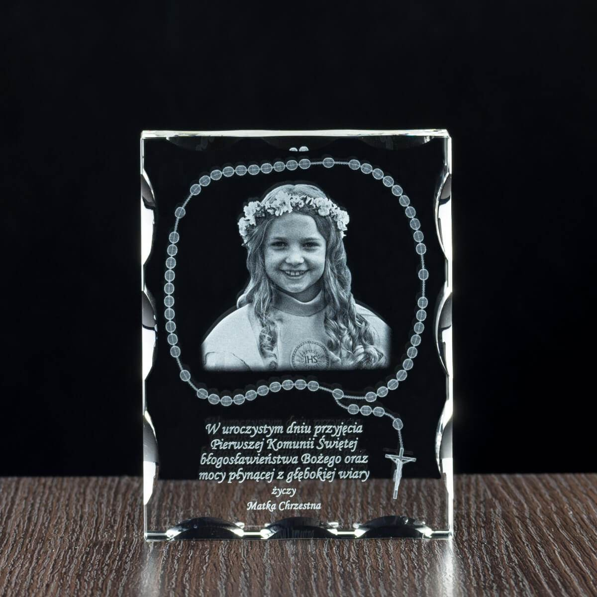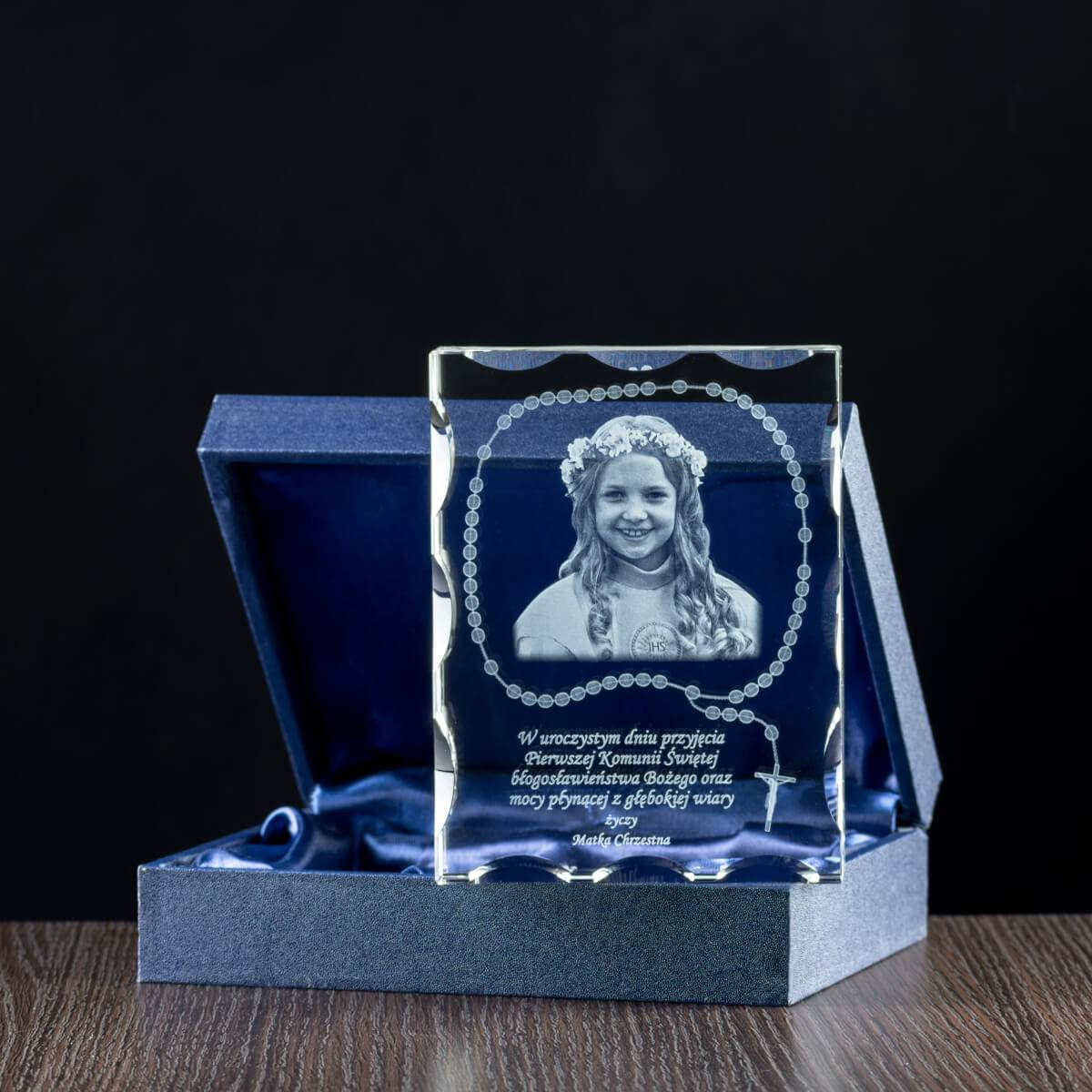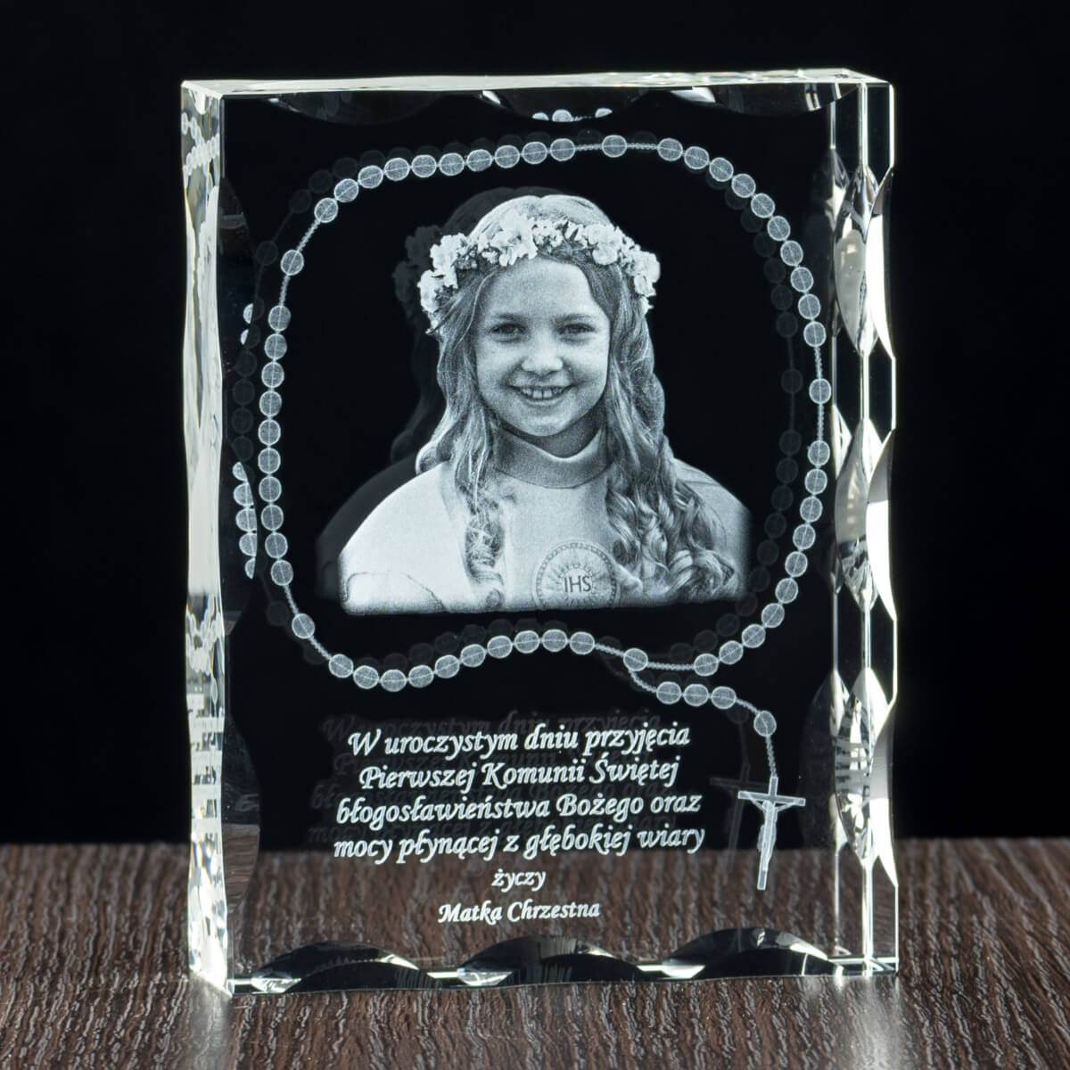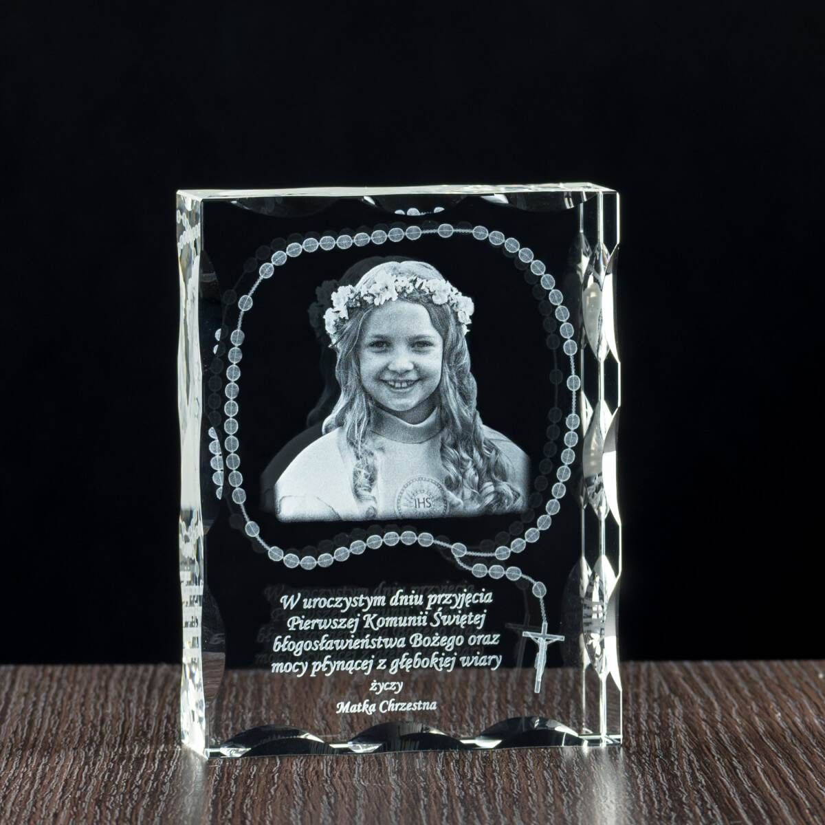 - Statuetka kryształowa z wygrawerowanym zdjęciem otoczonego trójwymiarowym różańcem. Aby podkreślić wartość kryształu, dodaj własną dedykację. Pamiątka na komunię w postaci kryształu jako unikalny upominek prosto z serca.