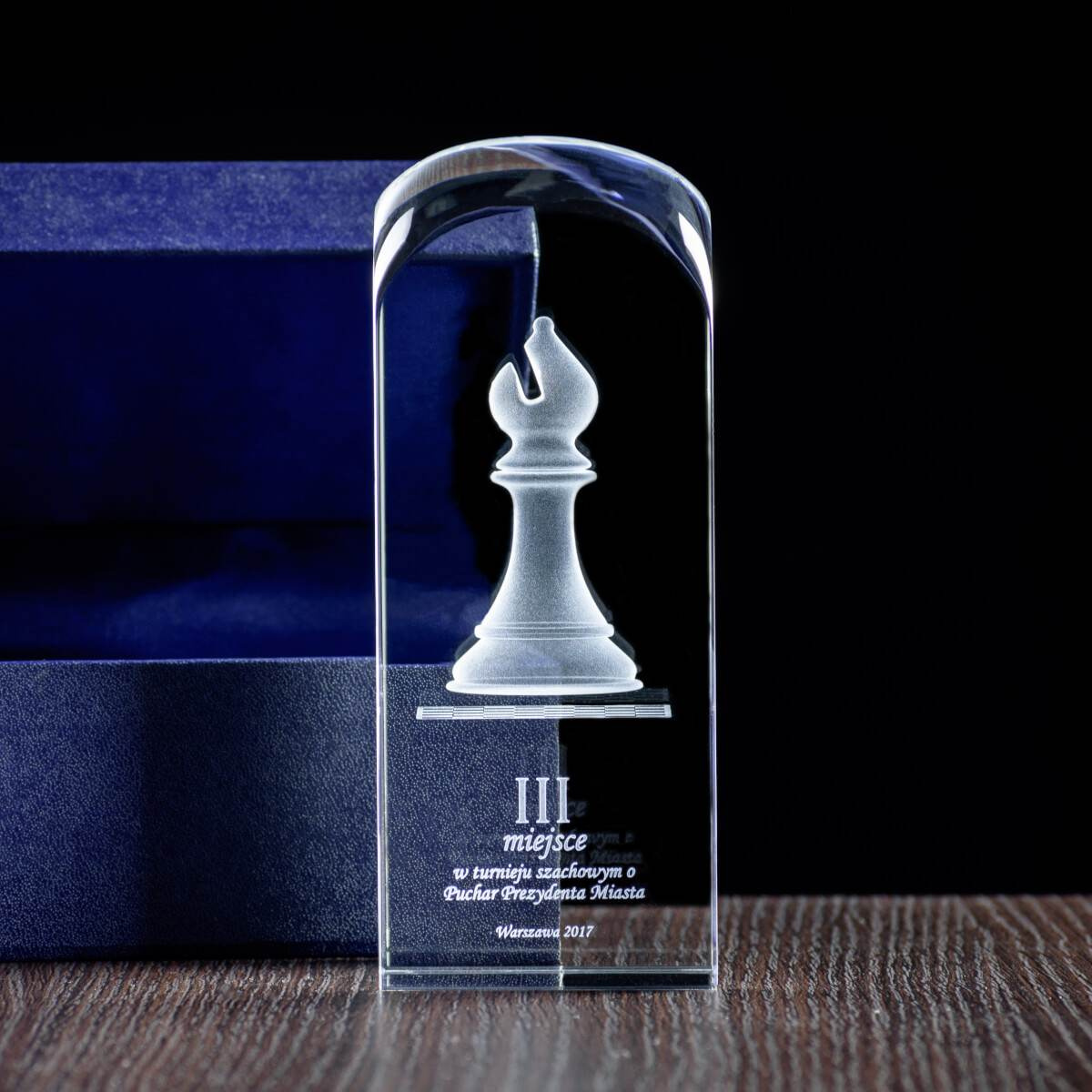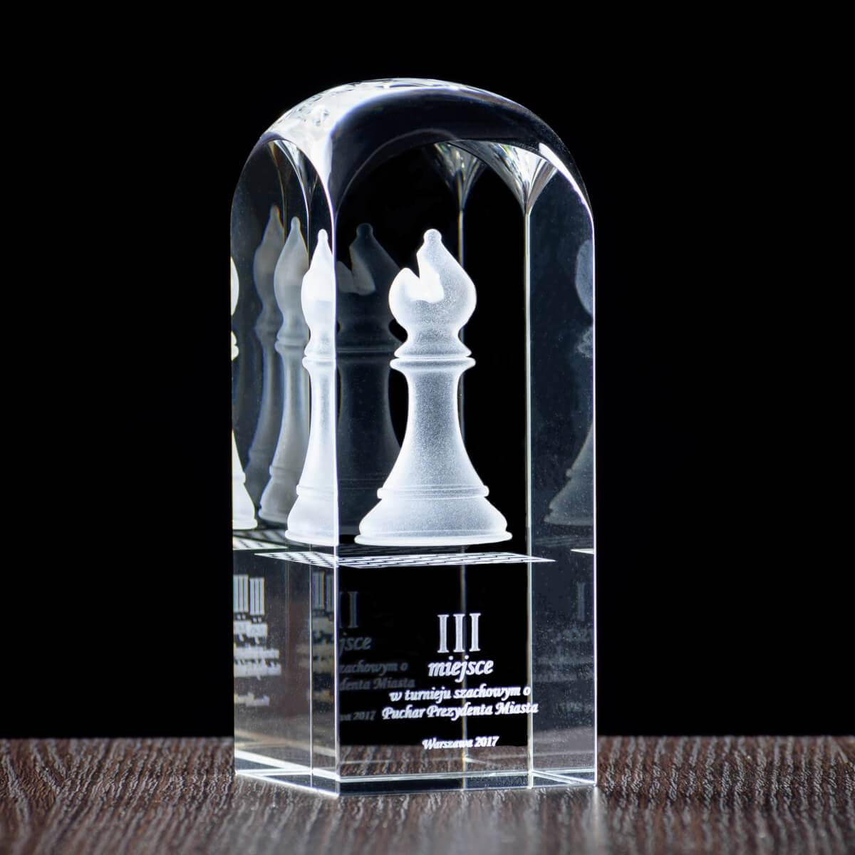 - Figura szachowa, w tym przypadku goniec, wygrawerowana wraz z dedykacją w szklanej statuetce. To propozycja na III nagrodę w konkursie szachowym. Kryształ pakowany w eleganckie etui.