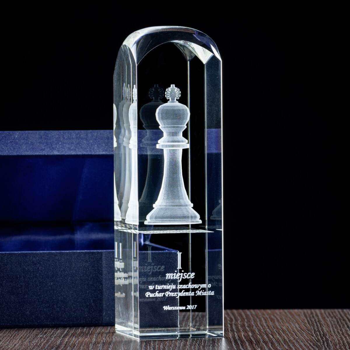Król, czyli kluczowa figura na szachownicy wygrawerowana w szklanej bryle jako nagroda za zajęcie I miejsca w konkursie szachowym bądź jako wyróżnienie dla działacza, sportowca za wkład w rozwój tej dyscypliny sportu. Dedykacja całkowicie spersonalizowana i zależna od oczekiwań kupującego. Statuetka pakowana w etui.