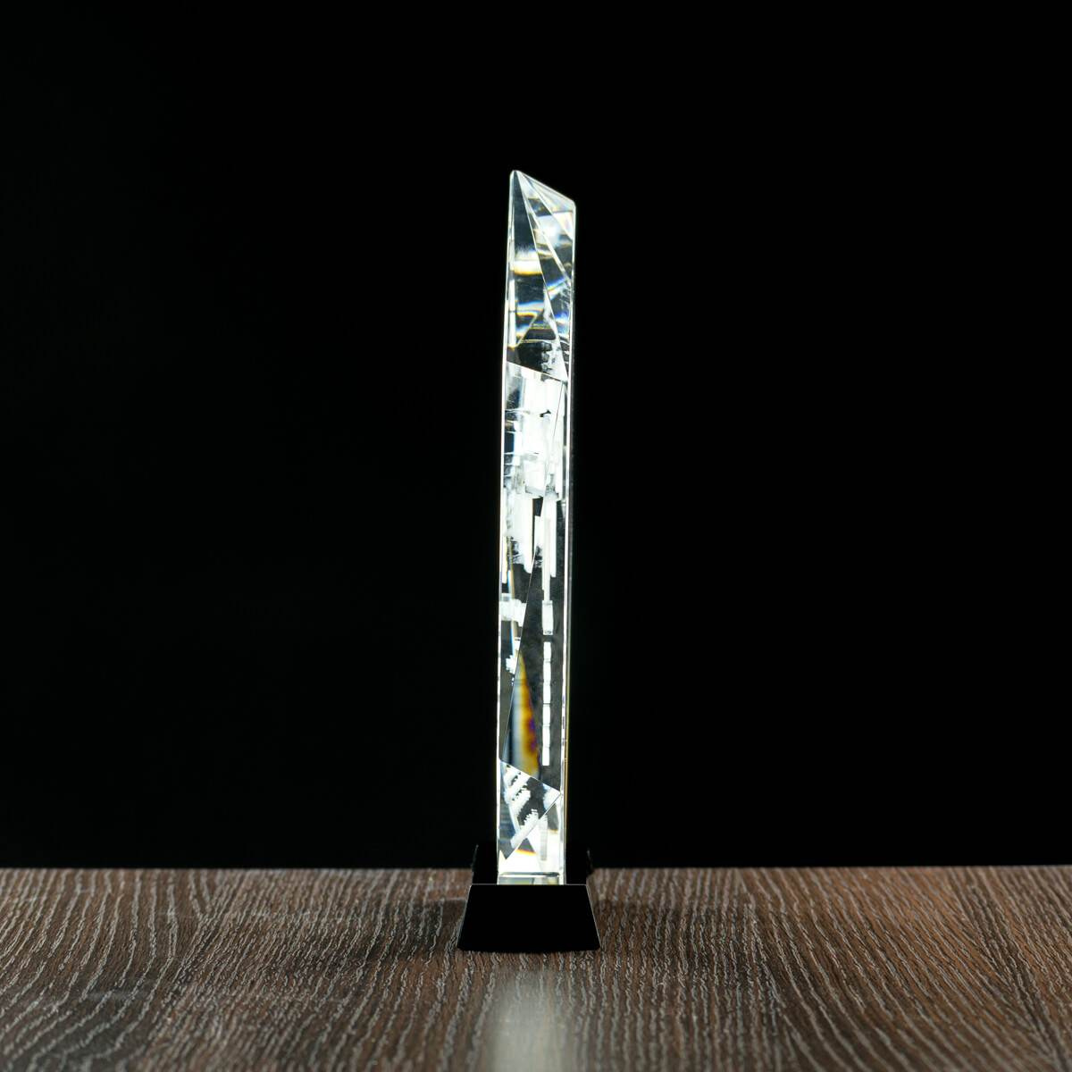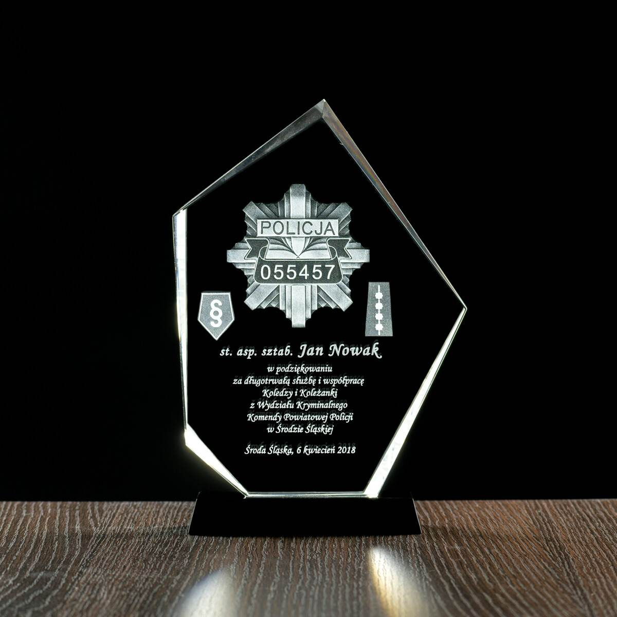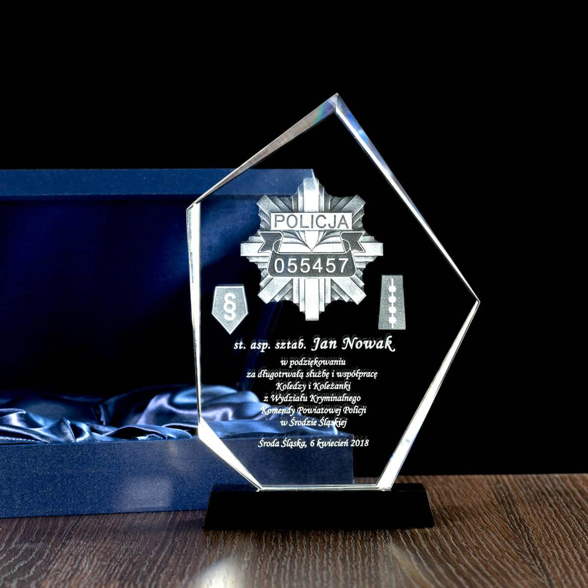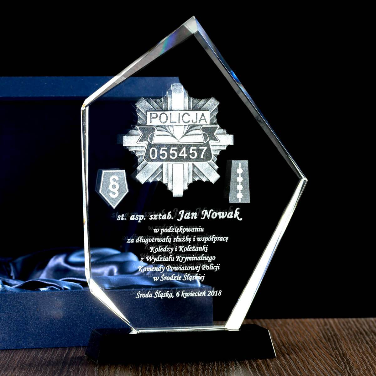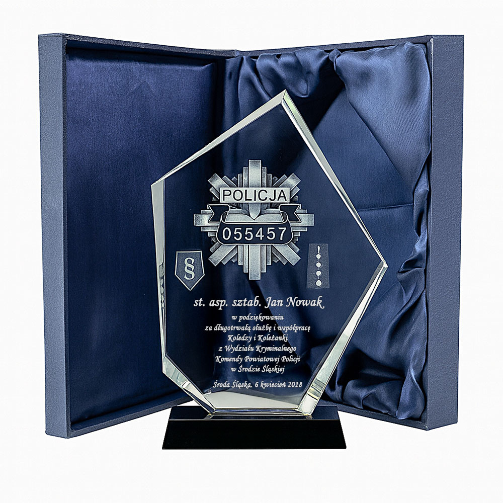 Duża statuetka z personalizowaną odznaką policyjną, stopniami oraz indywidualną dedykacją. Po przesłaniu wszystkich informacji przygotujemy projekt i prześlemy do akceptacji. Statuetka składa się ze szkła przezroczystego w którym nanosimy grawer oraz z podstawy z czarnego kryształu. Kryształ pakowany jest w eleganckie etui.