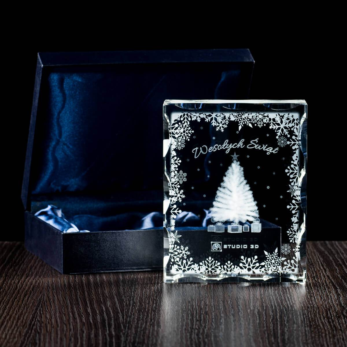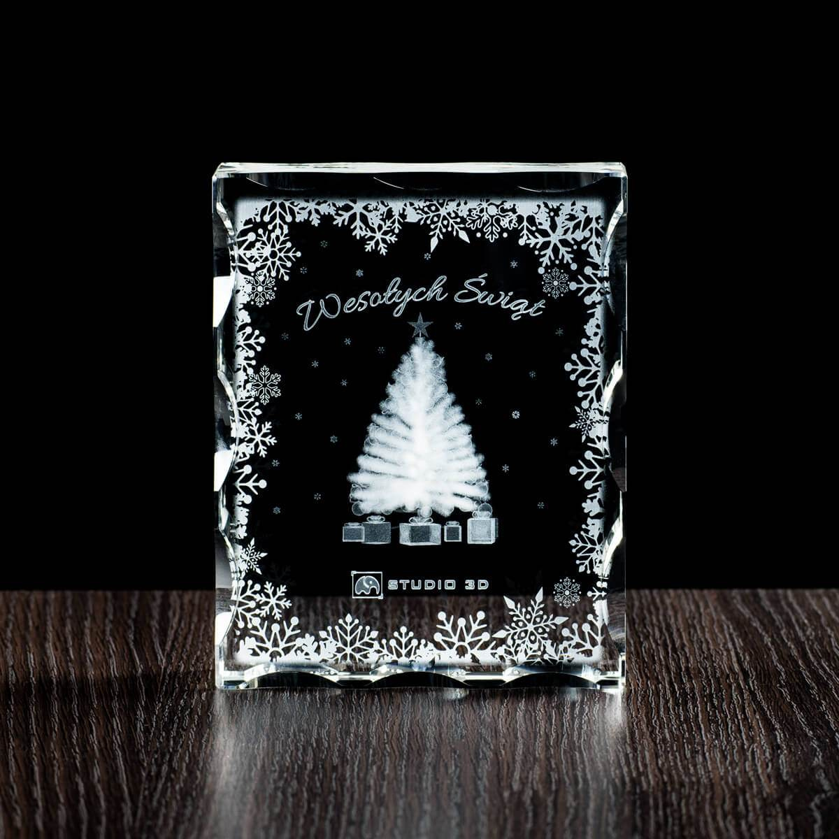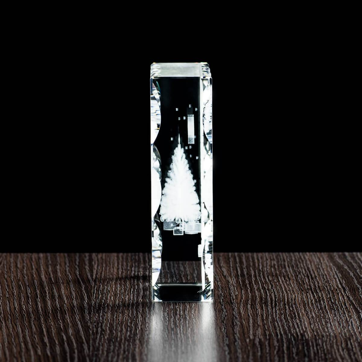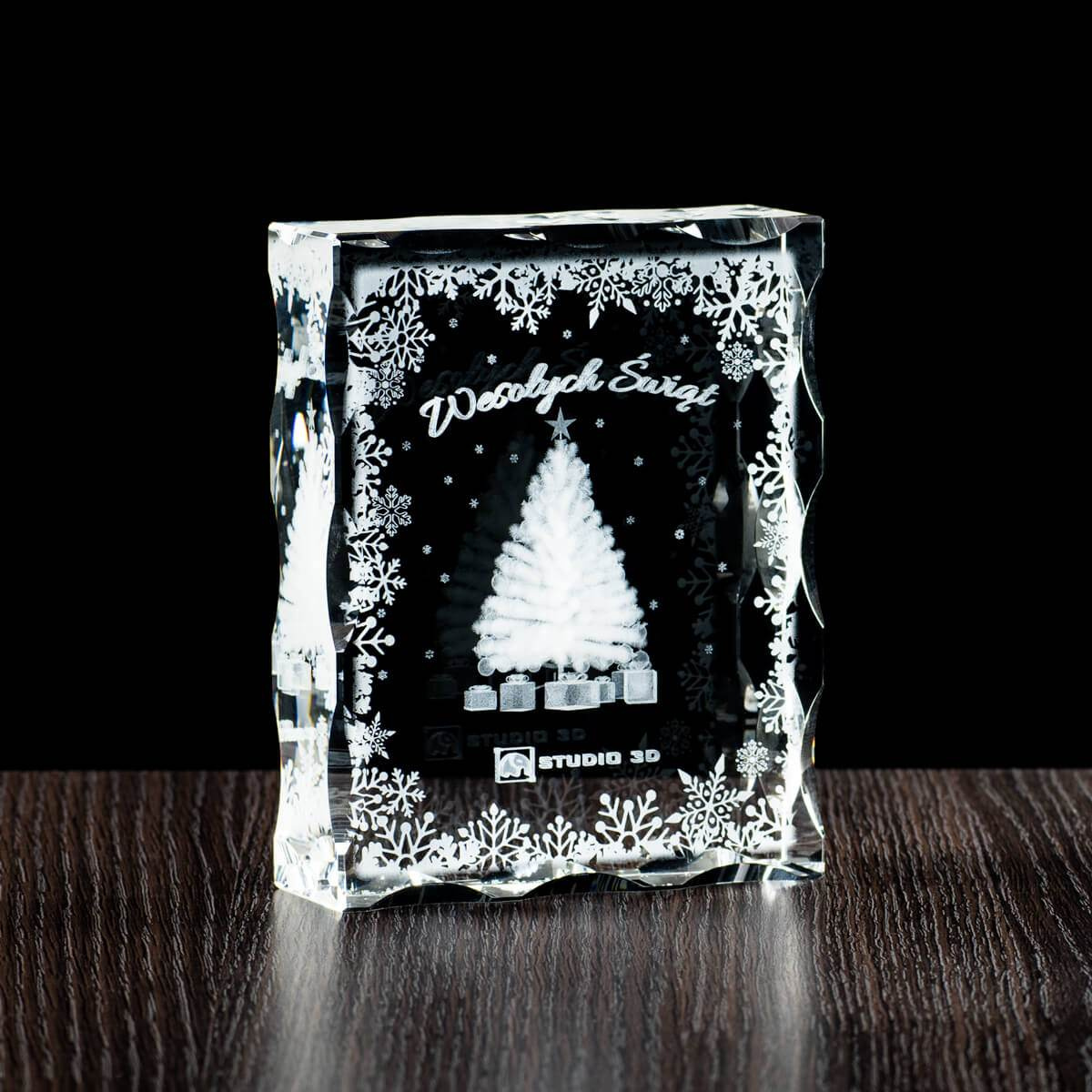 Personalizowany upominek świąteczny, który może być zarazem prezentem świątecznym, jak i znakomitą wizytówką firmy. W skład zamówienia wchodzi duża statuetka o wymiarach 120x150x40mm oraz etui. Wewnątrz statuetki znajduje się świąteczny grawer 3D