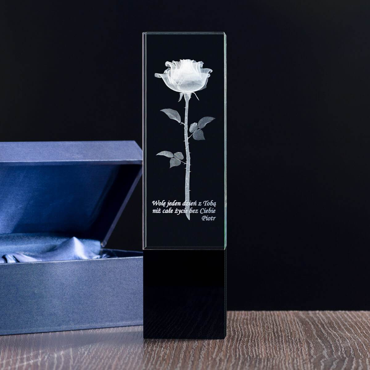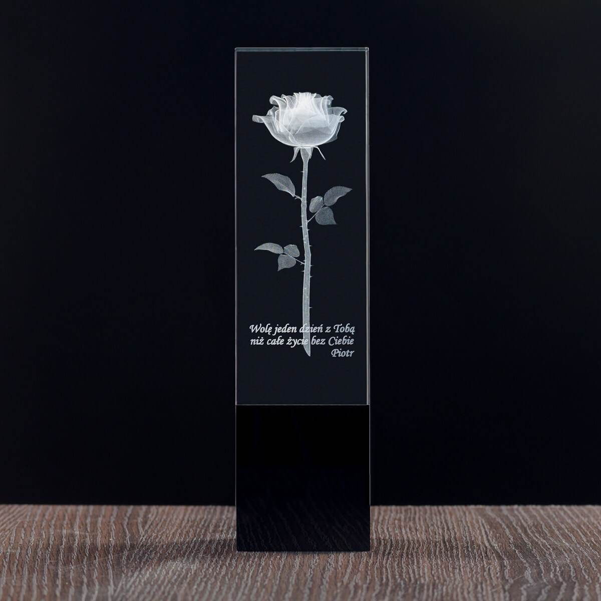 - Wysoka statuetka z czarną podstawą i wygrawerowaną wewnątrz piękną trójwymiarową różą, będzie doskonałym prezentem na Dzień Nauczyciela, lub zakończenie roku szkolnego. Dzięki indywidualnej dedykacji możesz odwdzięczyć się wychowawcy.