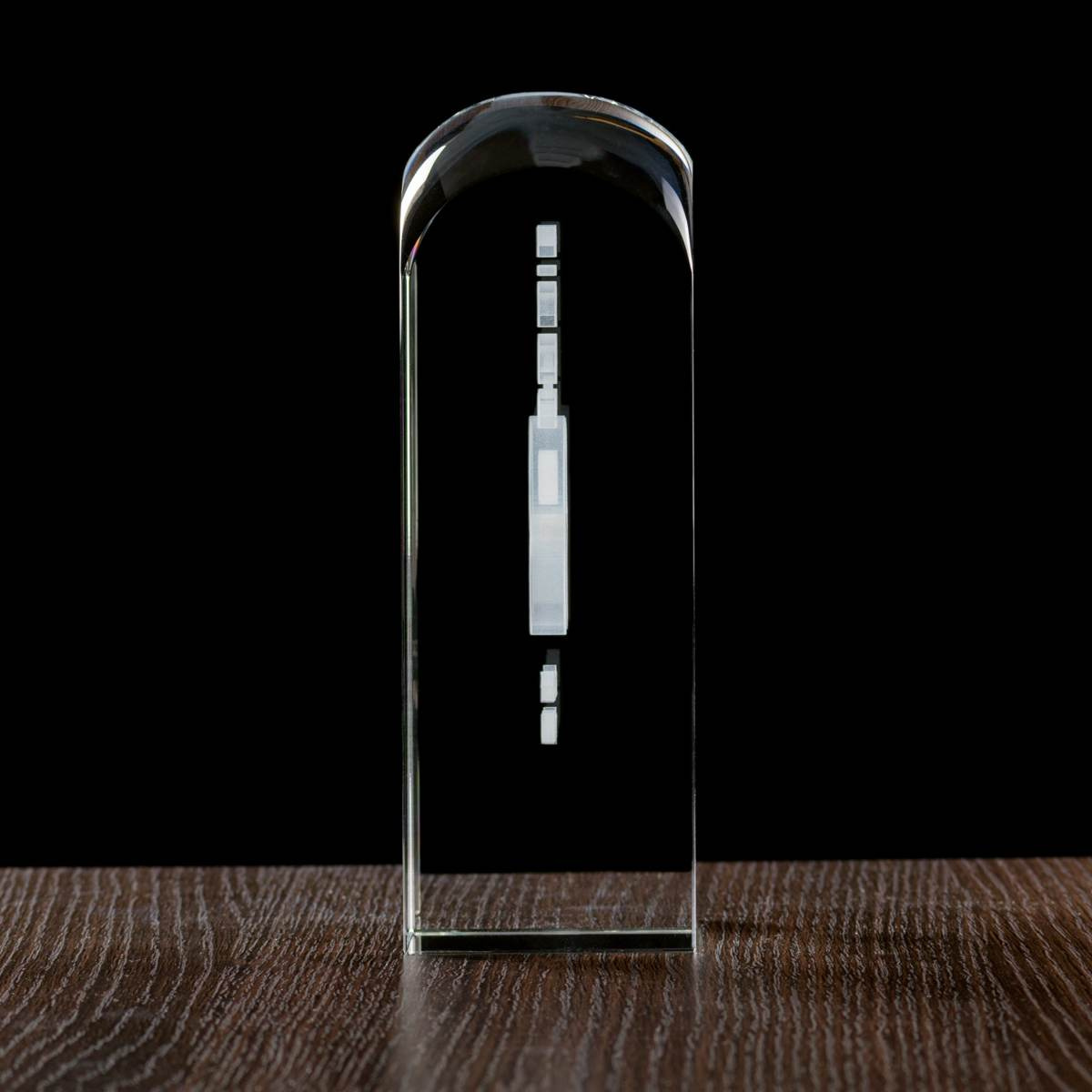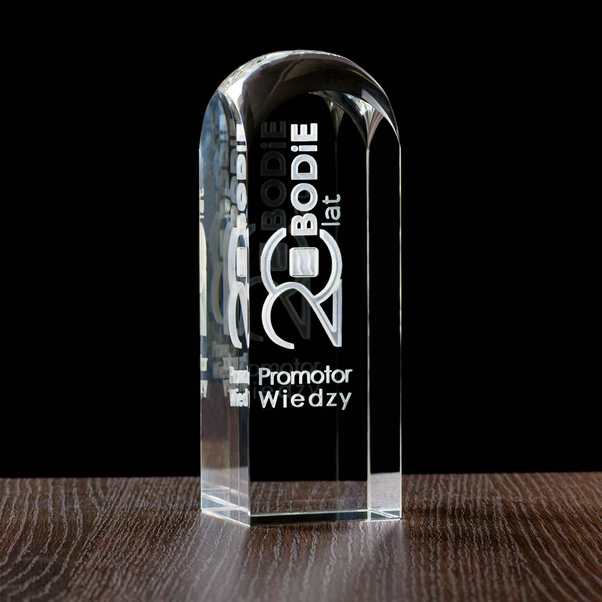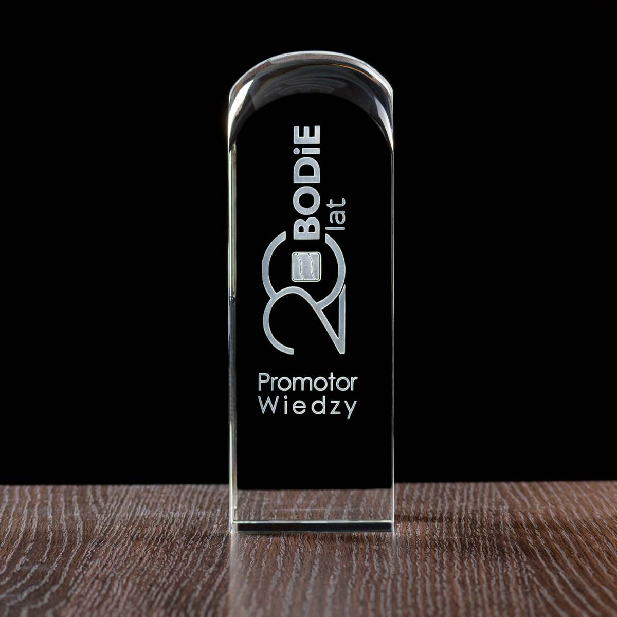 Statuetka w kształcie kolumny z okazji jubileuszu firmy. Wygrawerowana grafika firmowa oraz jubileuszowy tekst to elementy personalizowanej statuetki.