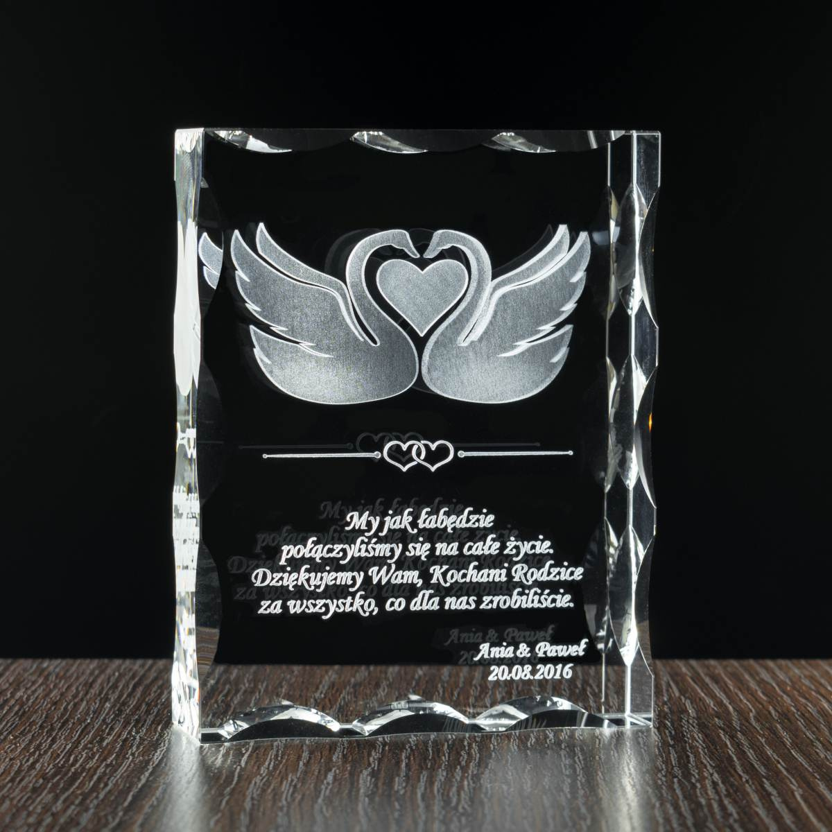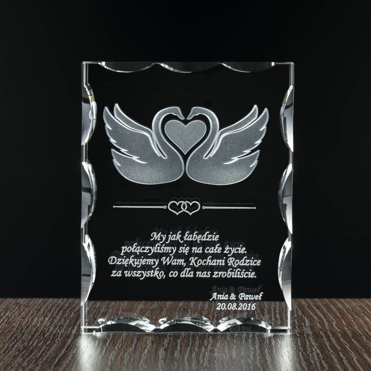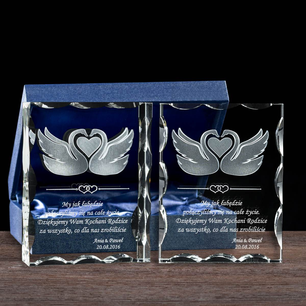 Elegancki komplet podziękowań dla rodziców za trudy w wychowaniu jako prezent od Pary Młodej z grawerami łąbędzi oraz miejscem na dedykację. Zestaw kryształowych statuetek z wygrawerowanymi modelami łabędzi 3D na pewno zrobi spore wrażenie i pozostanie w pamięci na długo. Jakość trójwymiarowego graweru zapewnia precyzyjna maszyna laserowa. W zestawie etui do każdej ze statuetek oraz ściereczki z mikrofibry.