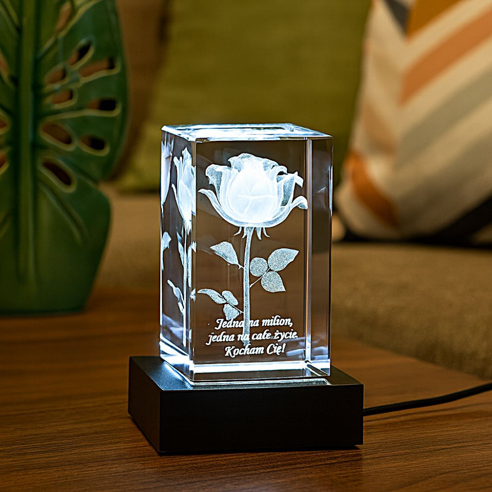 - Urokliwa statuetka z trójwymiarowym grawerunkiem róży i dedykacją „Jedna na milion, jedna na całe życie. Kocham Cię!” to wyjątkowy symbol uczuć. W zestawie eleganckie etui oraz podstawka LED, która rozświetla wnętrze i dodaje magii każdemu wnętrzu.