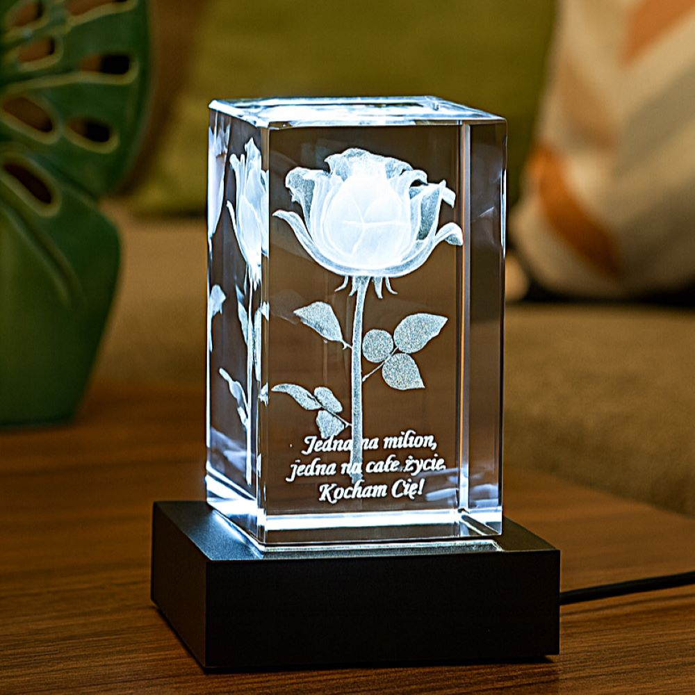 Romantyczna statuetka kryształowa 3D z grawerunkiem przestrzennej róży to idealny sposób, by wyrazić to, co trudno ująć słowami. Wewnątrz szklanego bloku o wysokości 80 mm znajduje się misternie wykonany grawerunek trójwymiarowej róży, a pod nim dedykacja: „Jedna na milion, jedna na całe życie. Kocham Cię!” — która może zostać dowolnie zmieniona na Twoją własną wiadomość.