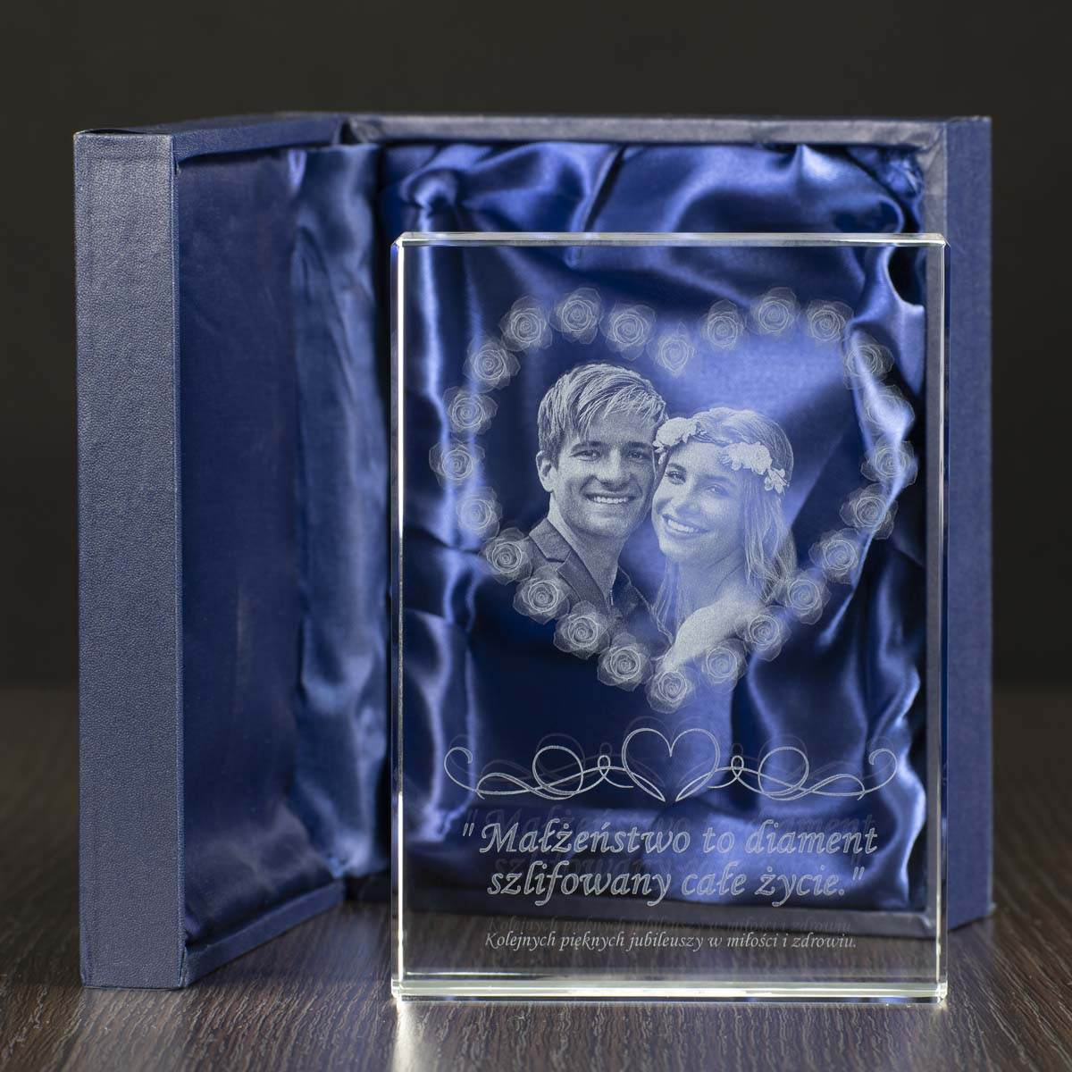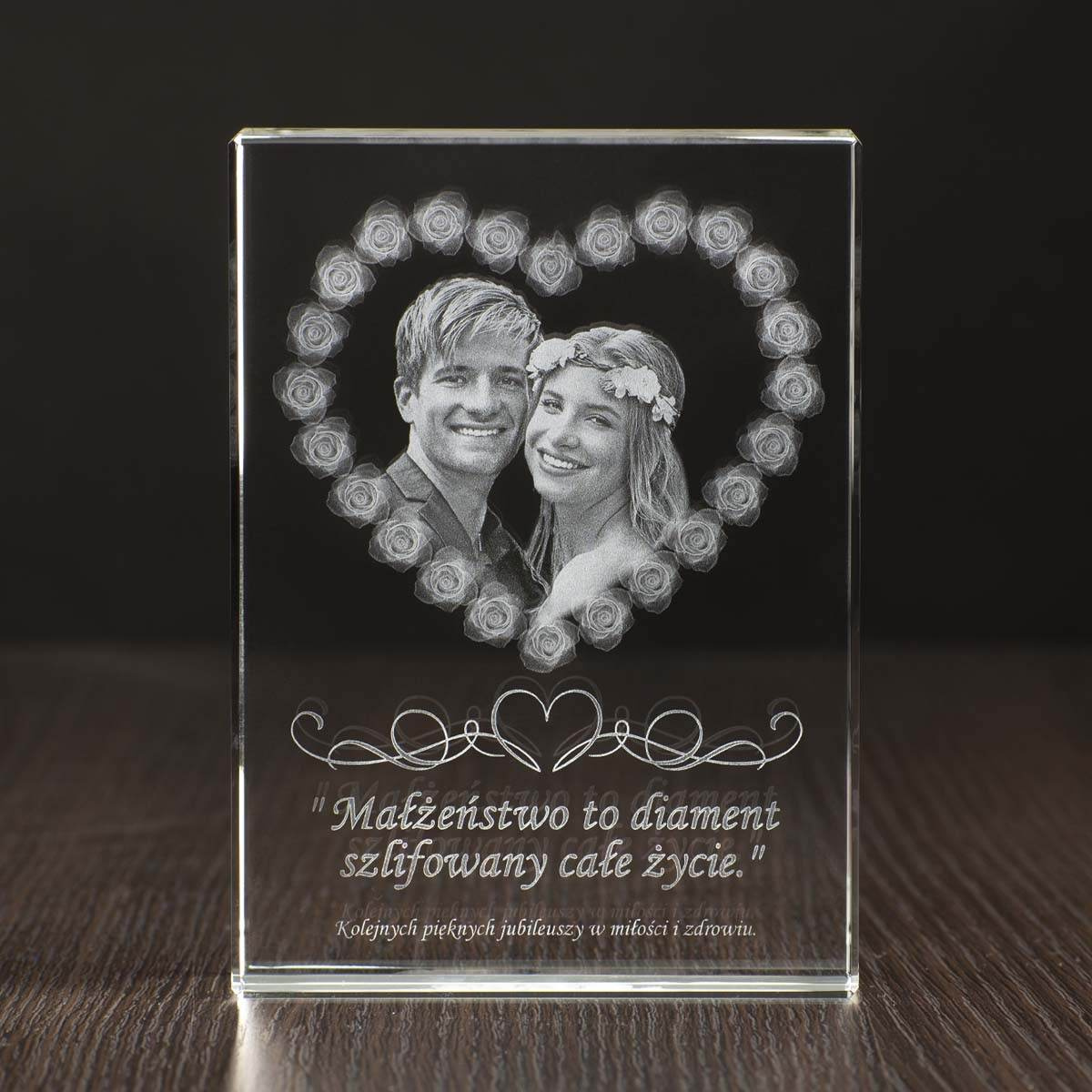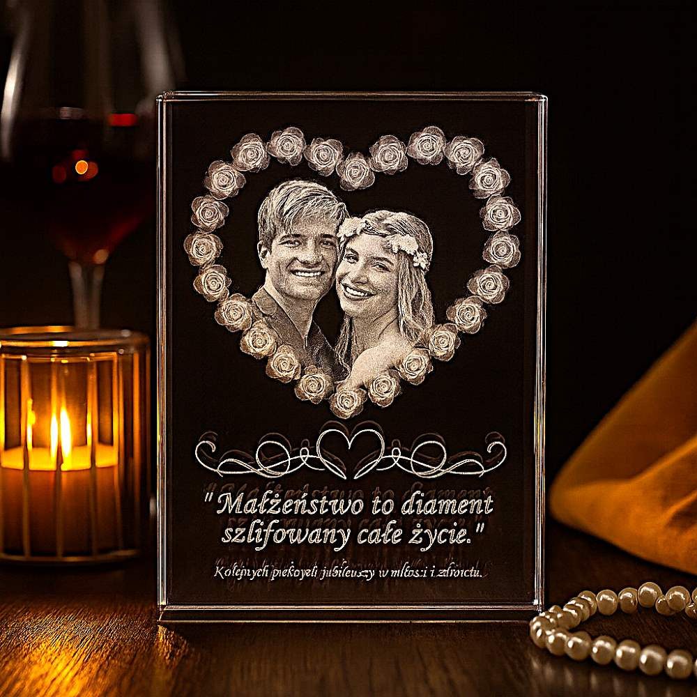 - Statuetka w kształcie płyty płaskiej z bardzo ciekawym trójwymiarowym (3D) wzorem serca złożonym z róż. Zdjęcie pary idealnie komponuje się w środku serca. Indywidualna dedykacja dopełnia całość projektu co czyni go wspaniałym prezentem na rocznicę ślubu.