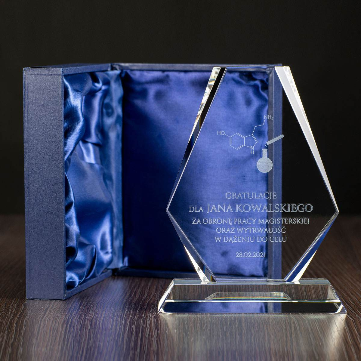 Pamiątka dla chemika. Szklana statuetka z wygrawerowanym wzorem chemicznym. Jako podziękowania dla nauczyciela chemii bądź gratulacja dla ucznia za dobre wyniki z tego przedmiotu. Dedykacja całkowicie spersonalizowana. Obrazek w formie graweru 2D (płaski).