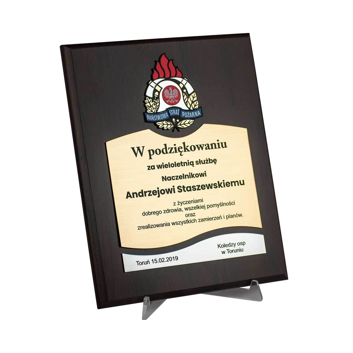 Na górze dyplomu znajduje się wygrawerowane logo PSP – symbol odwagi i poświęcenia strażaków. Całość zdobi elegancka tabliczka wykonana ze złotego i srebrnego laminatu, umieszczona na solidnym, drewnianym podkładzie.