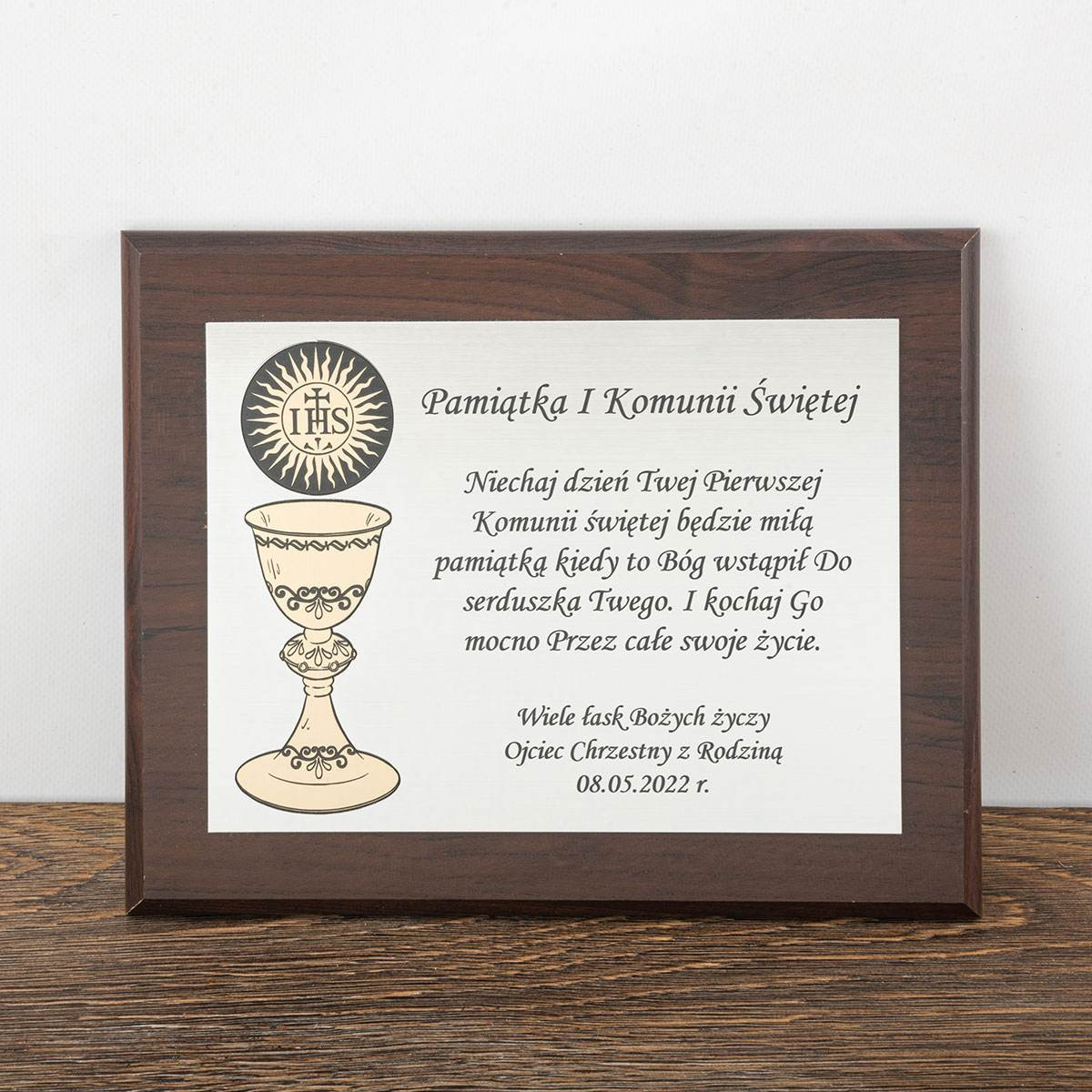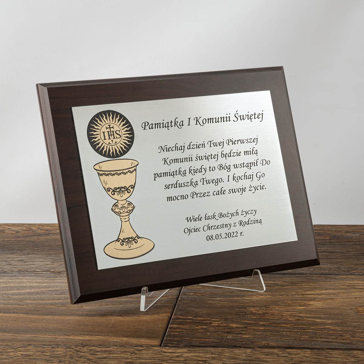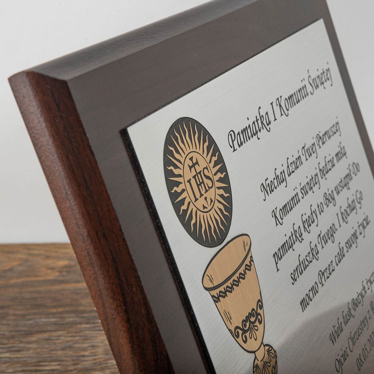 Dyplom z grawerem kielicha z hostią. Prezent dla dziecka z okazji I Komunii Świętej. Elegancka pamiątka komunijna. Dedykacja na dyplomie całkowicie dowolna. Tabliczka przymocowana na stałe do drewnianego podkładu. Możliwość dokupienia etui lub podstawki z plexi.