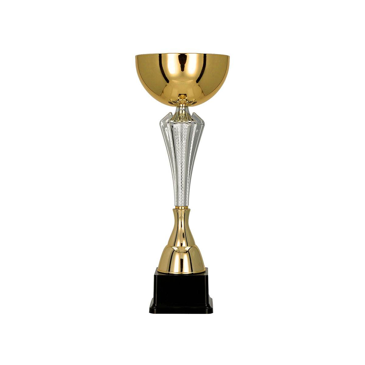 - Klasyczny wzór pucharu w kolorze srebrno-złotym. Wysokość nagrody 32 cm. Duży estetyczny kielich osadzony na czarnej podstawie.