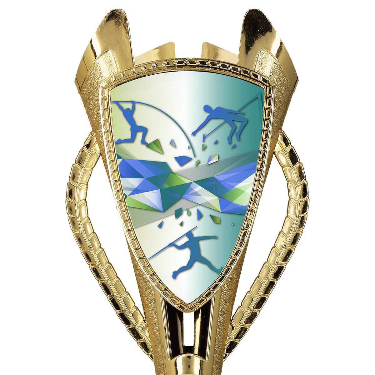 - Złoty puchar z tworzywa z grafiką umieszczoną na tarczy dotyczącą zawodów lekkoatletycznych. Wysokość pucharu 34.5 cm. Możliwość personalizacji na podstawce.