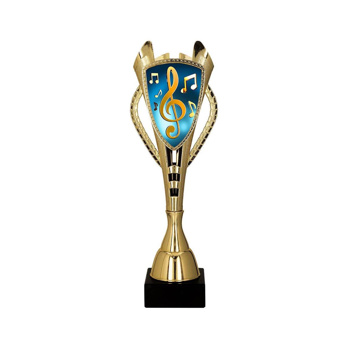 - Złoty nowoczesny puchar z grafiką dedykowaną konkursom muzycznym. Możliwośc personalizacji grawerem na tabliczce.