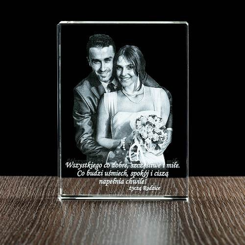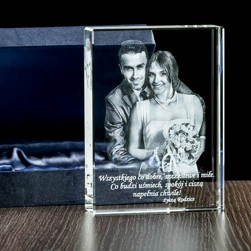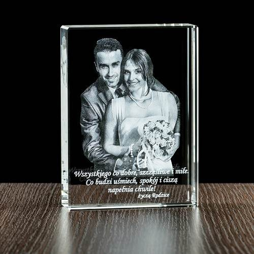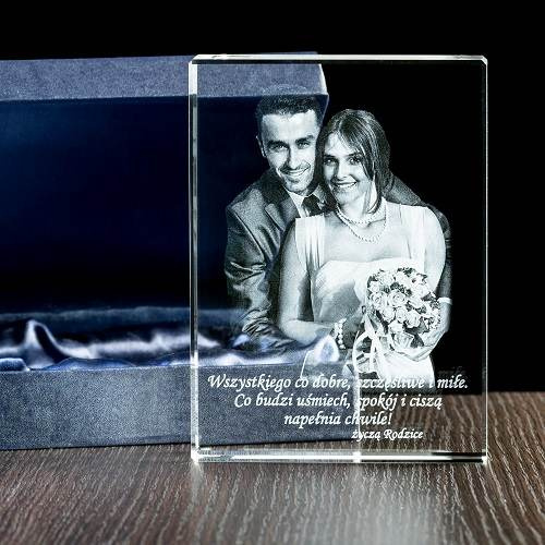 - Elegancka statuetka kryształowa Płyta płaska 100×150×30 mm z grawerem zdjęcia 2D. Idealna pamiątka ślubna lub podziękowanie dla Rodziców. Projekt przesyłany do akceptacji. Etui w komplecie.