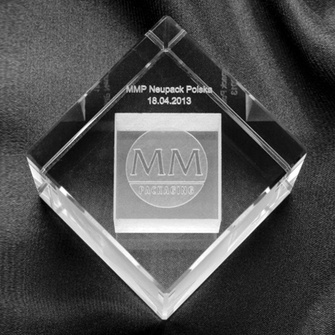 Logo firmy wygrawerowane w krysztale - przycisk do papieru