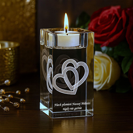 Świecznik z kryształu z grawerem - Dwa splecione serca 3D oraz Twoja dedykacja
