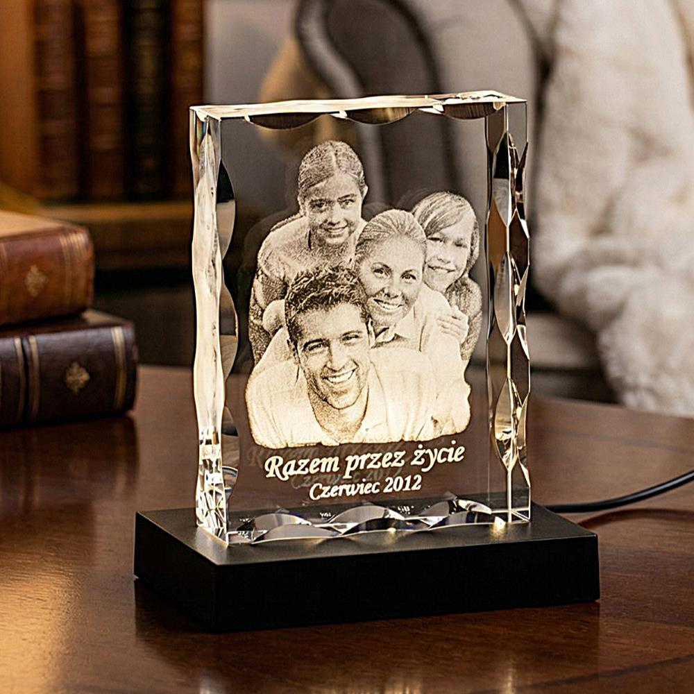 - Elegancka szklana fotolampka z precyzyjnym grawerem zdjęcia 2D i personalizowanym napisem. Podświetlana podstawka LED tworzy efektowną, premium lampkę nocną – doskonałą na rocznicę lub prezent świąteczny.