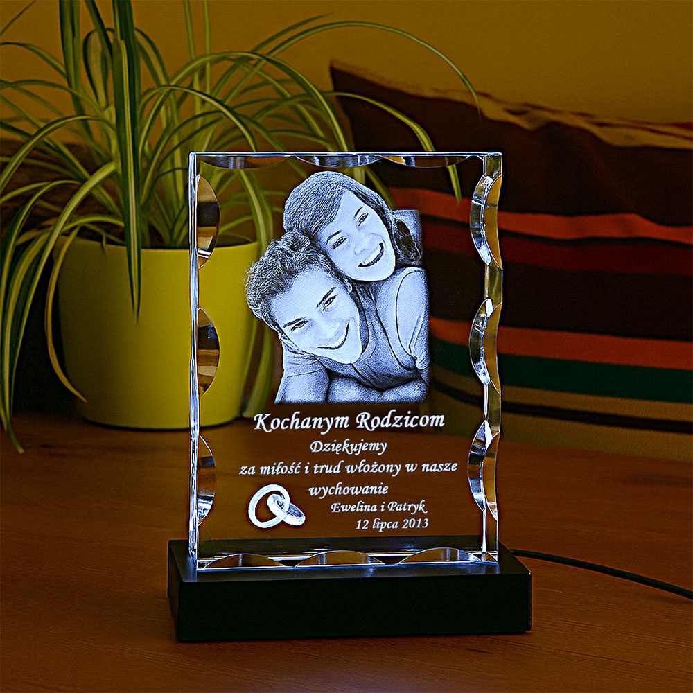 - Wyjątkowa statuetka kryształowa 3D z indywidualnym grawerunkiem zdjęcia to wzruszający prezent z okazji rocznicy ślubu. Podświetlana podstawka LED wydobywa trójwymiarowy efekt i podkreśla każdy detal.