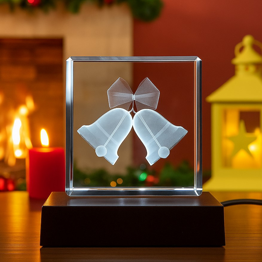 Wewnątrz szkła o wymiarach 80×80×80 mm laserowo wykonano trójwymiarowy motyw dzwonków, który po podświetleniu podstawą LED zyskuje wyjątkową głębię. Światło delikatnie rozprasza się wewnątrz bryły, dzięki czemu statuetka staje się nastrojową fotolampką 3D – idealną do świątecznych aranżacji wnętrz. Pod grawerem można umieścić krótki napis, życzenia lub logo, tworząc wyjątkowy upominek firmowy dla klientów i partnerów biznesowych. Doskonała jako lampka dekoracyjna w biurze, hotelu lub salonie, wprowadzająca subtelny, świąteczny akcent.
