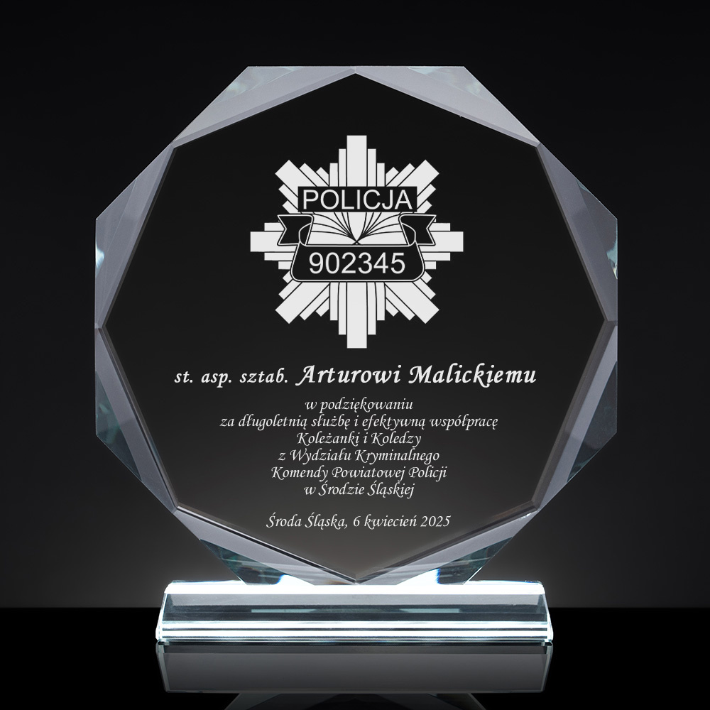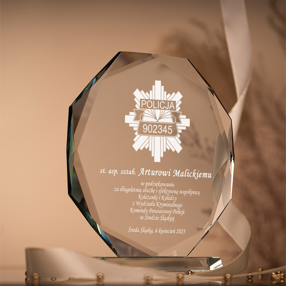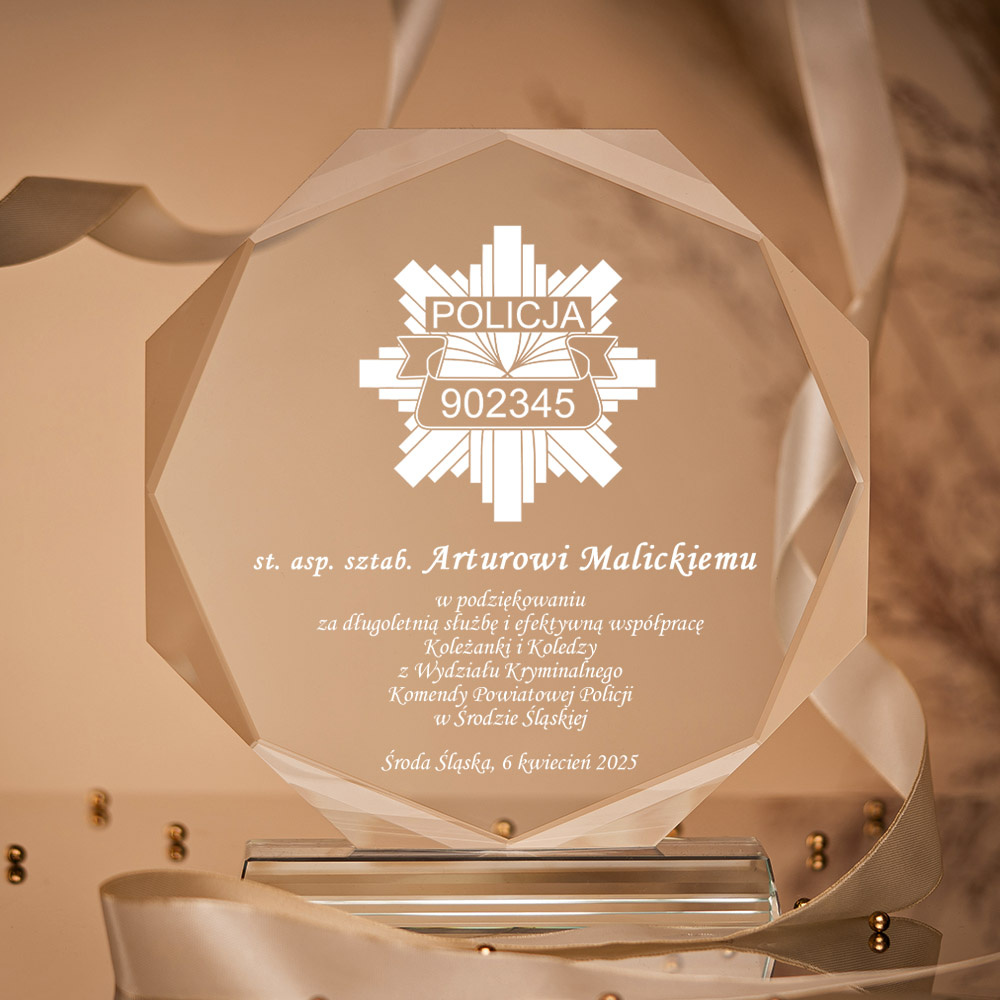 Szklana statuetka z grawerem dla policjanta odchodzącego na emeryturę to wyjątkowy, pełen szacunku upominek, który w piękny sposób podkreśla lata odpowiedzialnej, pełnej poświęcenia służby. Wykonana z wysokiej jakości szkła i ozdobiona precyzyjnym grawerem laserowym 2D, stanowi elegancką formę podziękowania za trud, odwagę oraz wkład w bezpieczeństwo społeczności. Na statuetce umieszczamy:
