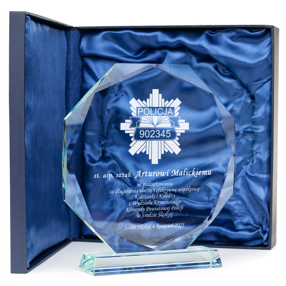 • Elegancka statuetka szklana z grawerem laserowym 2D to wyjątkowy prezent dla policjanta odchodzącego na emeryturę. Zawiera odznakę policyjną, numer ID i personalizowaną dedykację. Zapakowana w granatowe etui prezentowe.