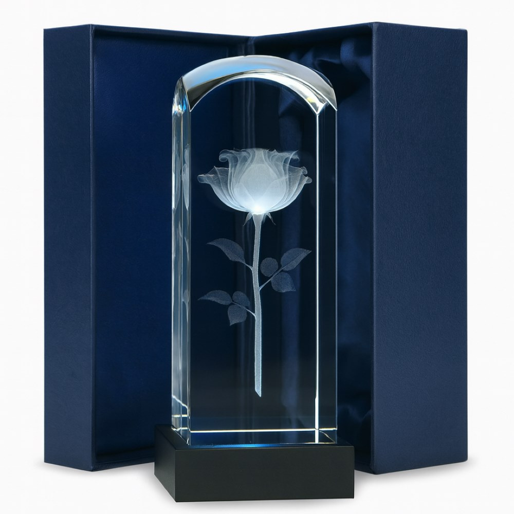 Kryształ z różą 3D na podstawce LED – wyjątkowy, personalizowany prezent