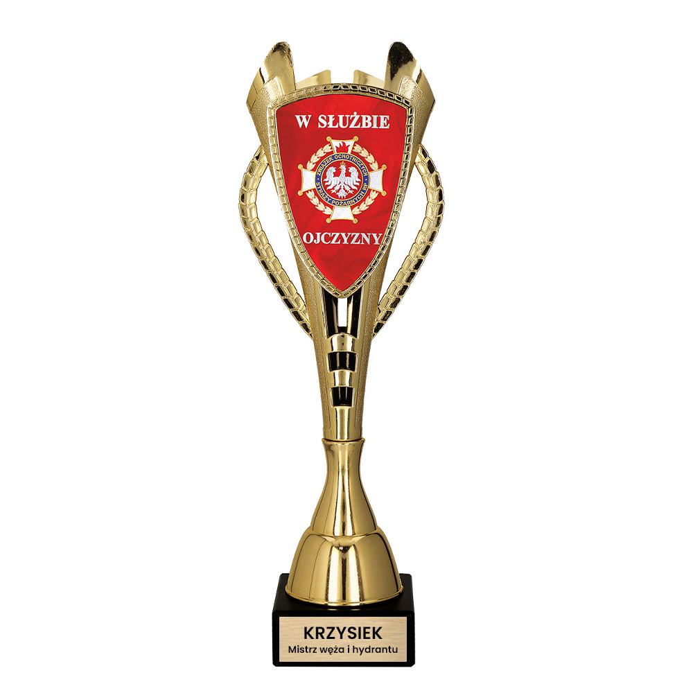 Ten elegancki, a zarazem zabawny puchar to doskonały pomysł na nagrodę podczas strażackich zawodów, festynów, jubileuszy czy spotkań integracyjnych OSP i PSP.