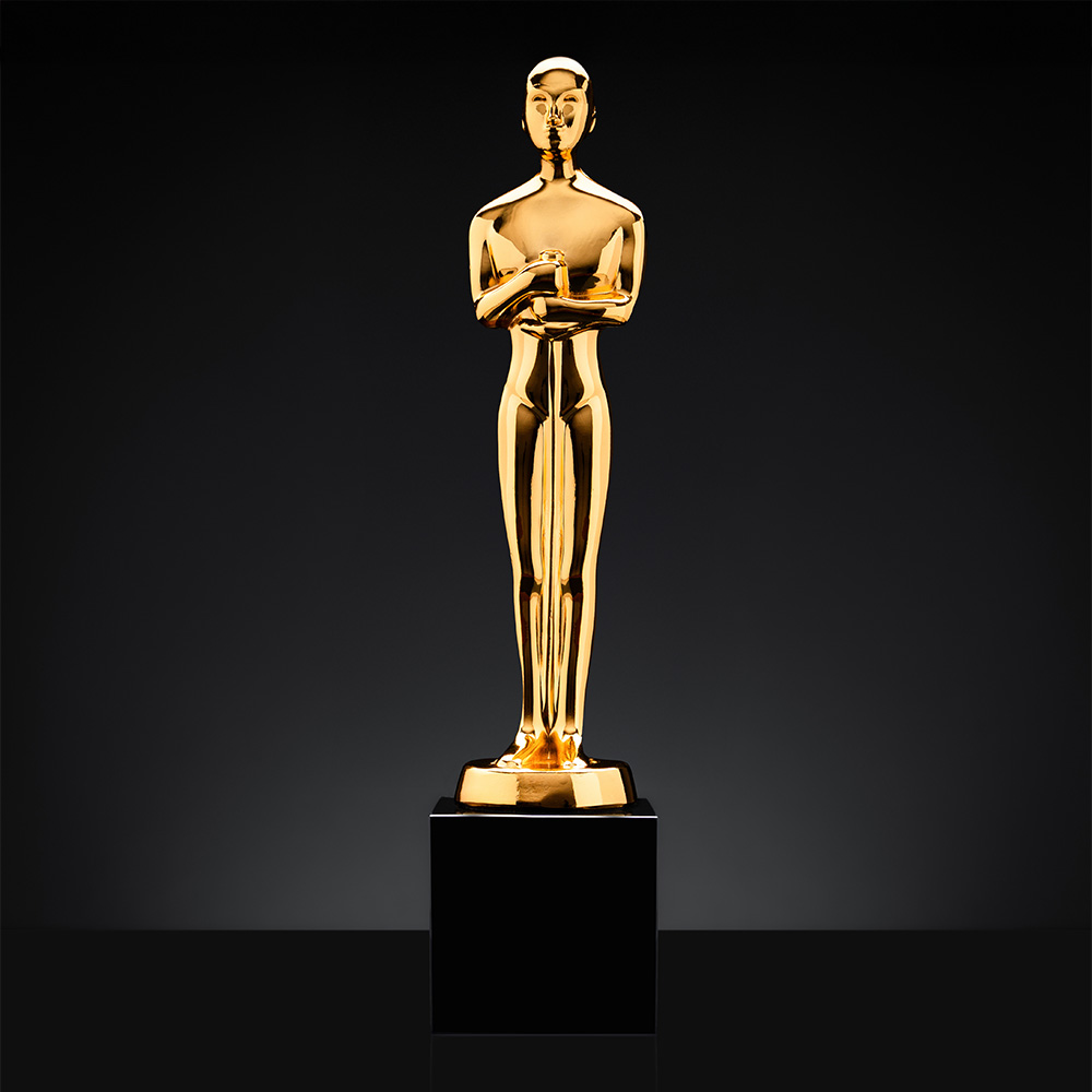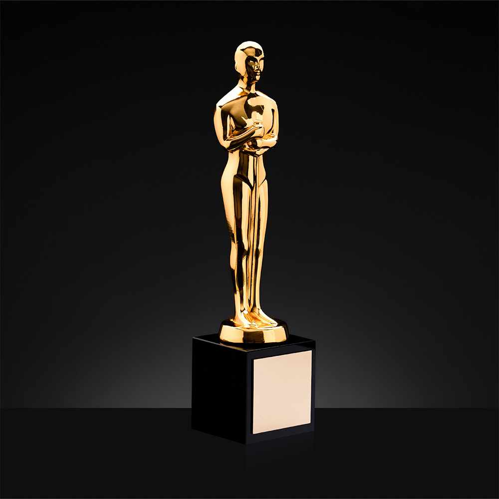 - materiał: postument z czarnego kryształu, metalowy odlew Oscara i tabliczka z laminatu