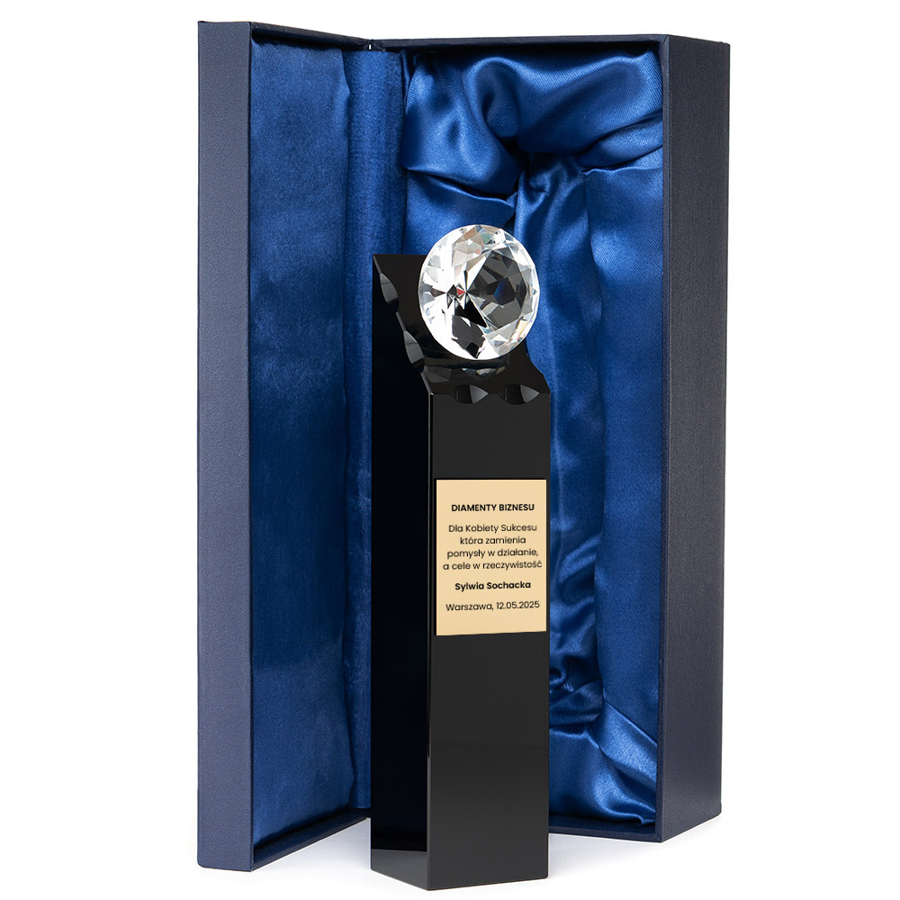 - materiał: kolumna z czarnego szkła, kryształowy diament i złota tabliczka z laminatu