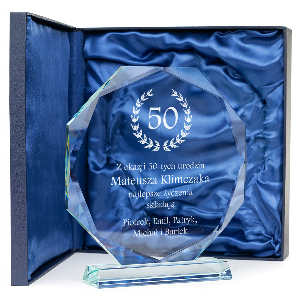 - Elegancka statuetka szklana z grawerem laserowym 2D to wyjątkowy prezent na 50. urodziny. Personalizacja obejmuje imię solenizanta, rocznicę, życzenia, datę oraz podpis osoby wręczającej. Całość zapakowana w granatowe etui prezentowe.