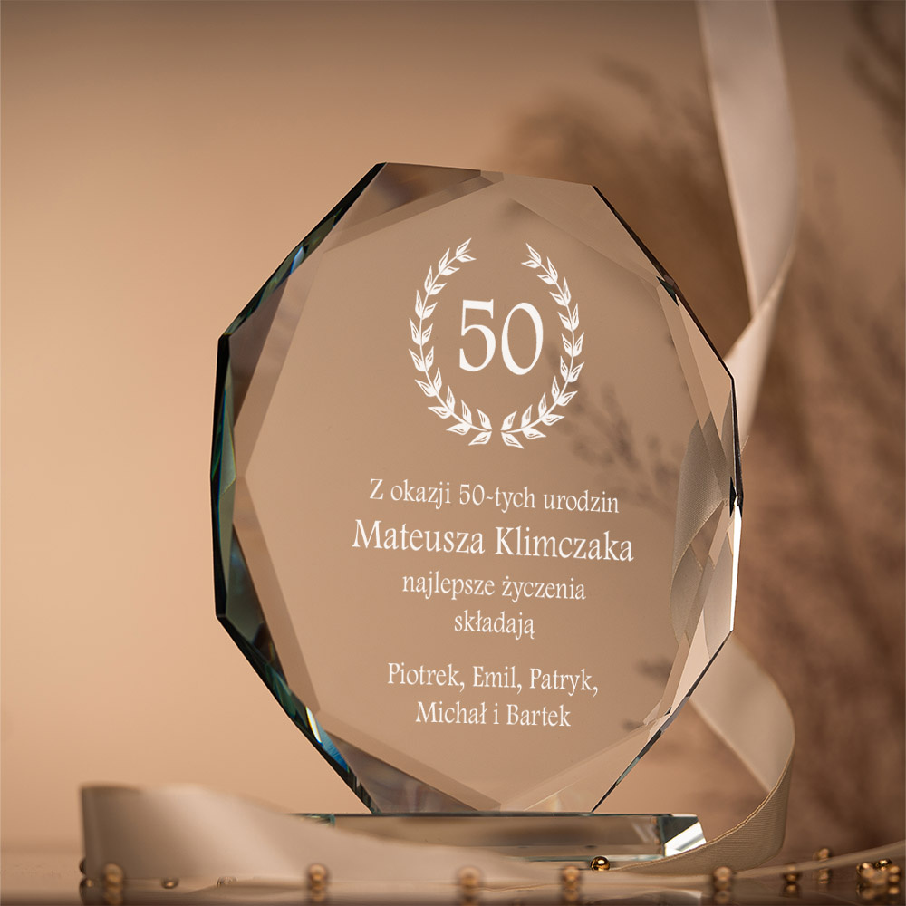 Szklana statuetka z grawerem na 50. urodziny – prezent personalizowany